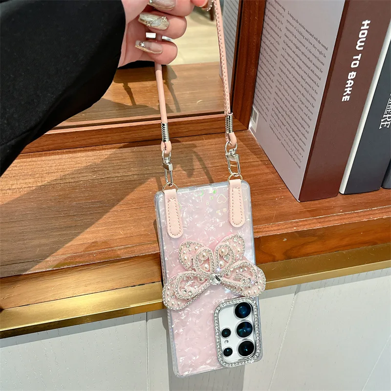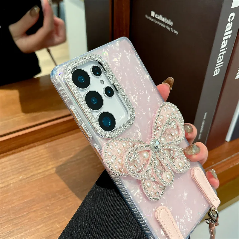 3D Laser Giltter Diamond Butterfly Case For Samsung Galaxy S24 S25 Plus Ultra FE S25 Edge With Wrist Strap Shockproof Cover