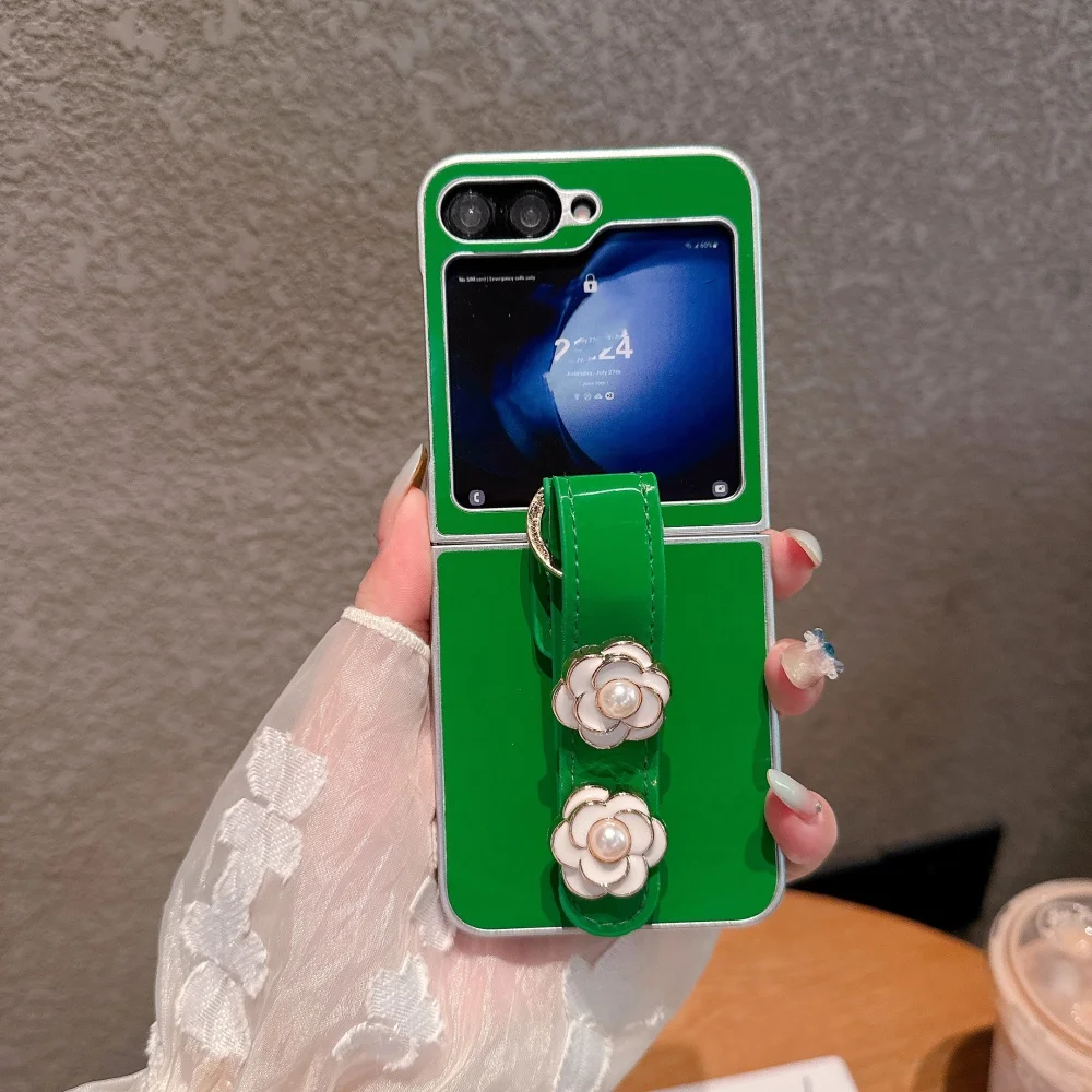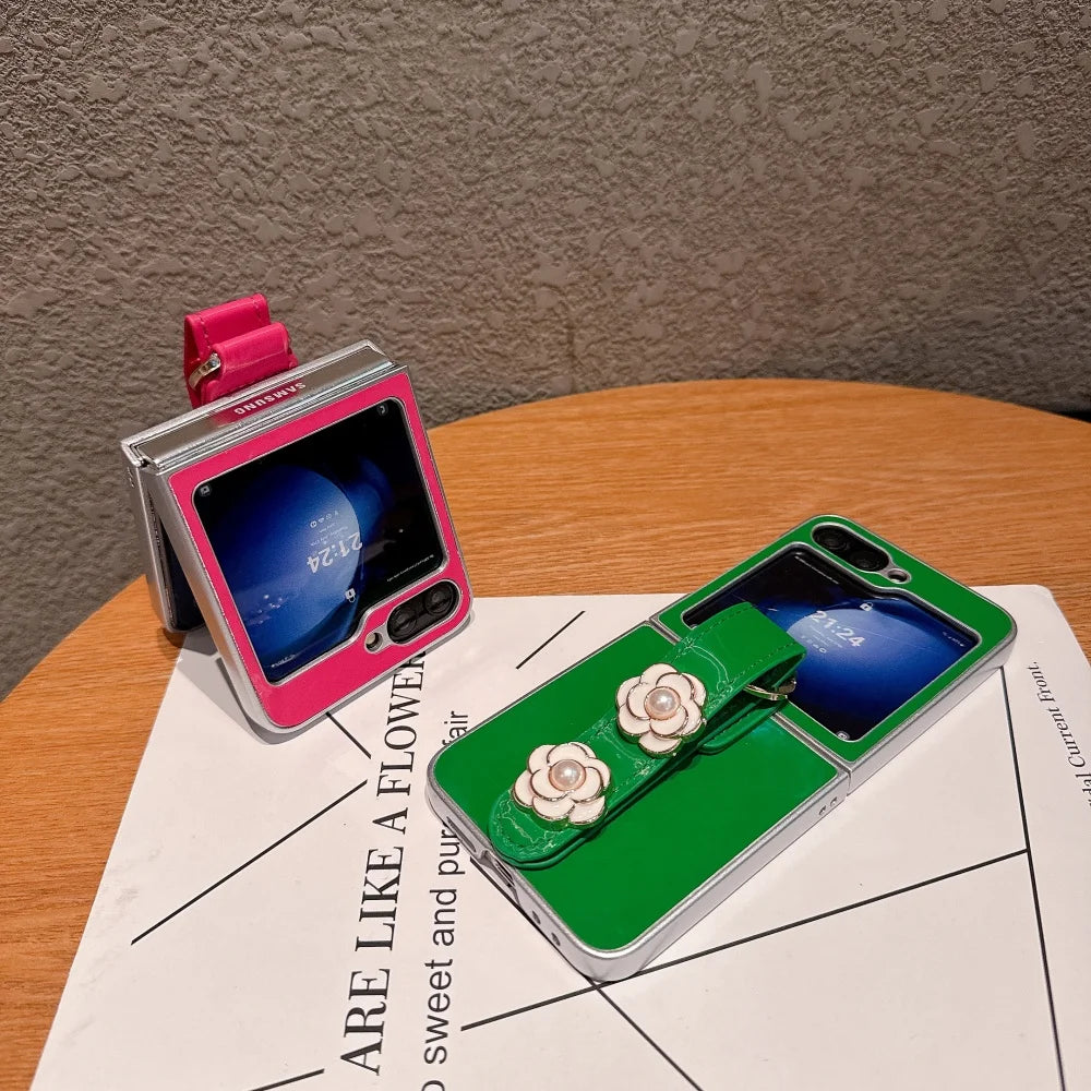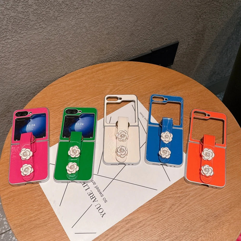 3D Pearl Camellia Flowers Wristband Phone Case for Samsung Galaxy Z Flip 7 6 5 4 3 Flip7 Zflip6 Plating Bumper Shockproof Cover