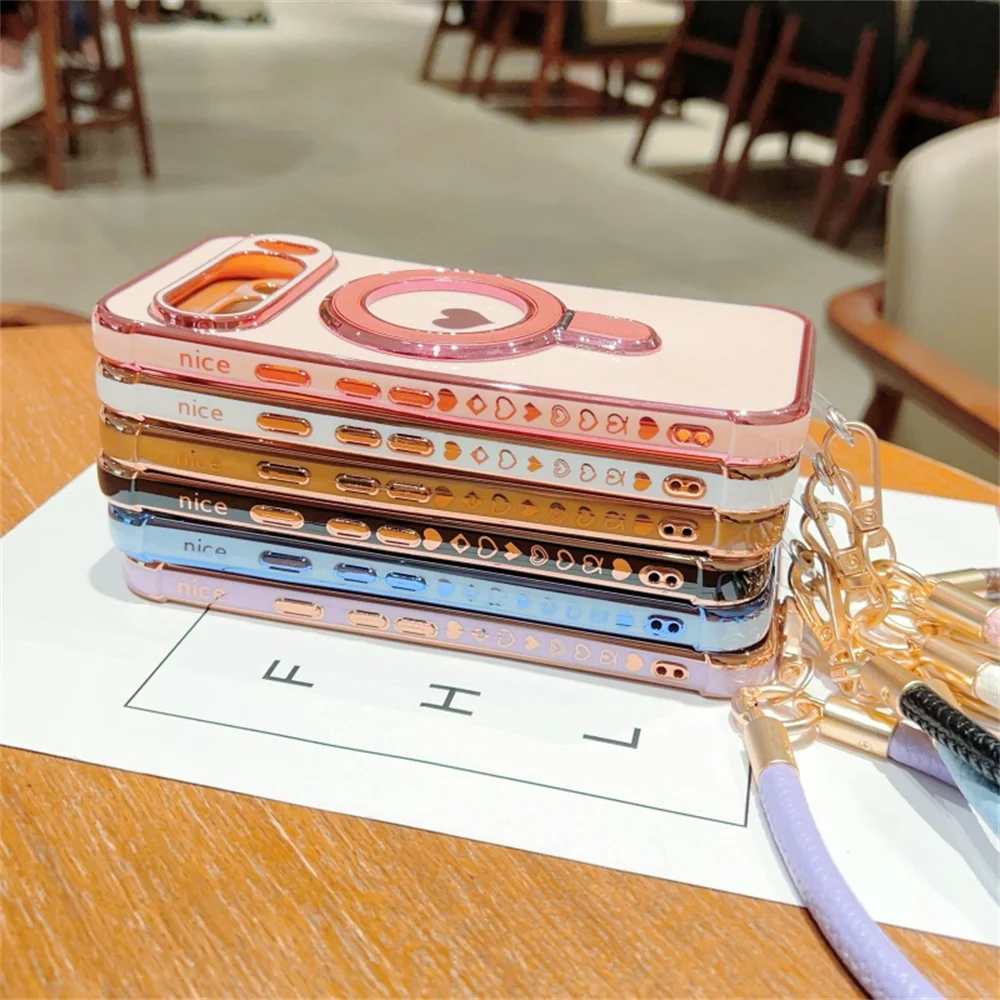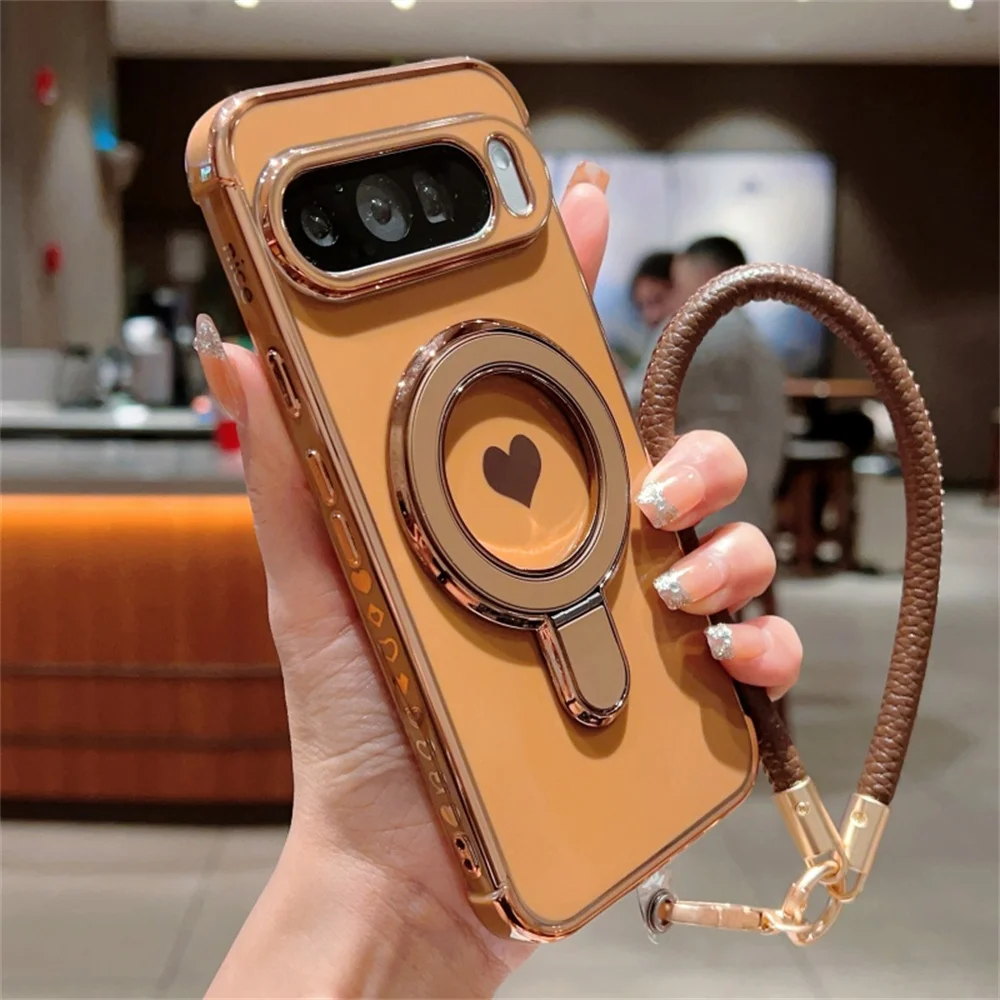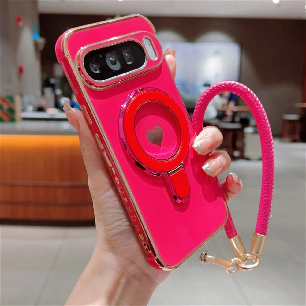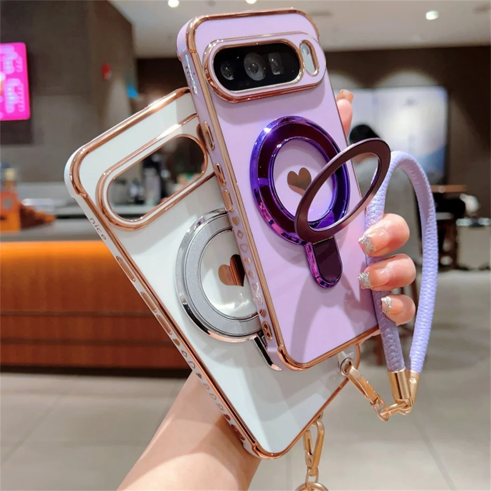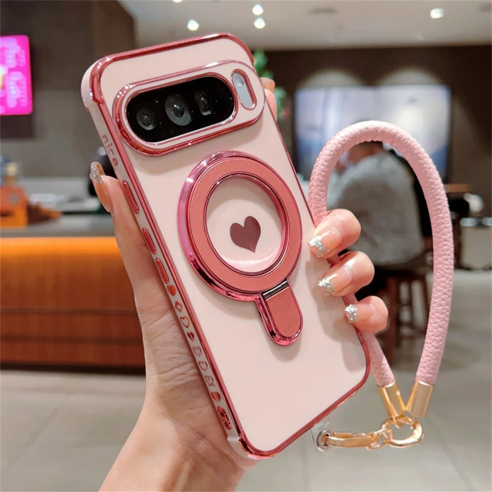 Cute Love Heart Wrist Strap Bracket Case for Google Pixel 8 9 Pro XL 9A 8A 7A Ring Holder Stand Lanyard Plating Soft TPU Cover