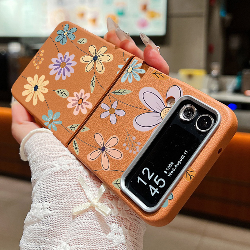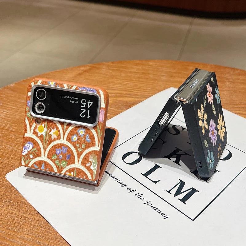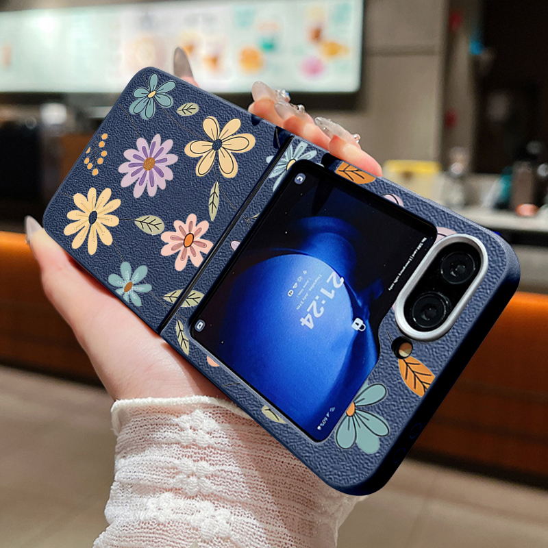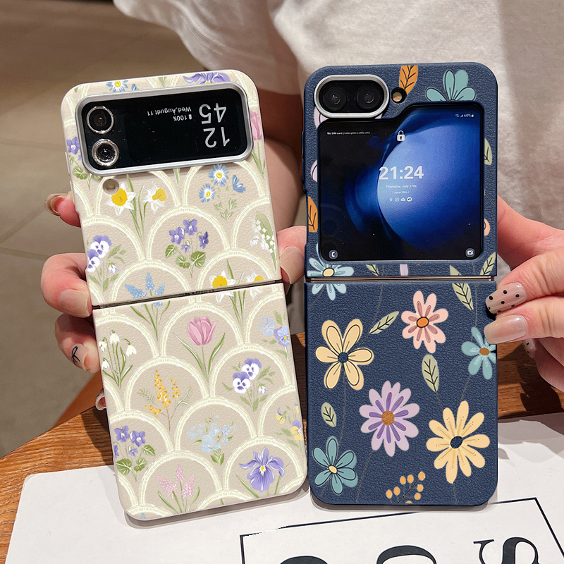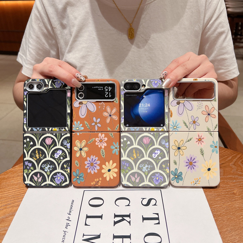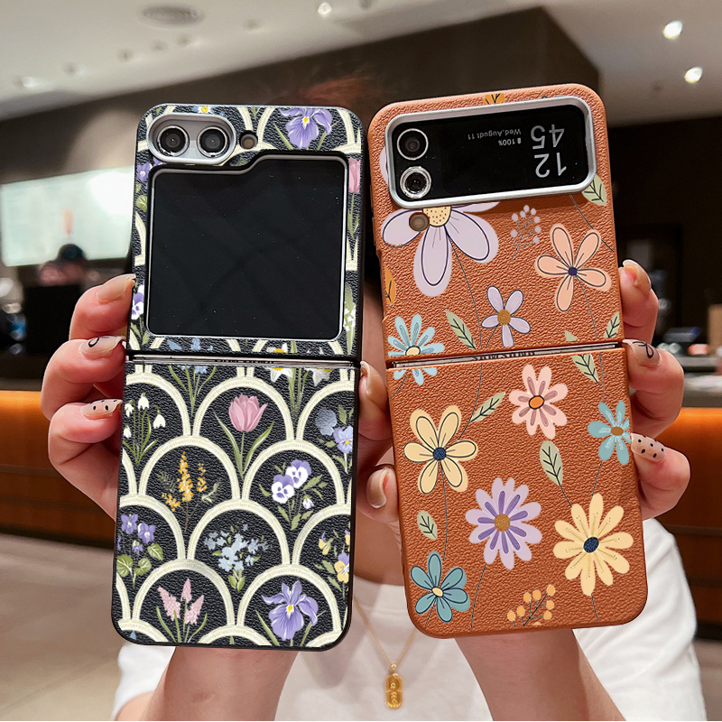 For Samsung Galaxy Z Flip 5 6 3 4 5G Cartoon Flowers Soft Case Leather Texture TPU Folding Phone Cover For Samsung Z Flip5 Flip4