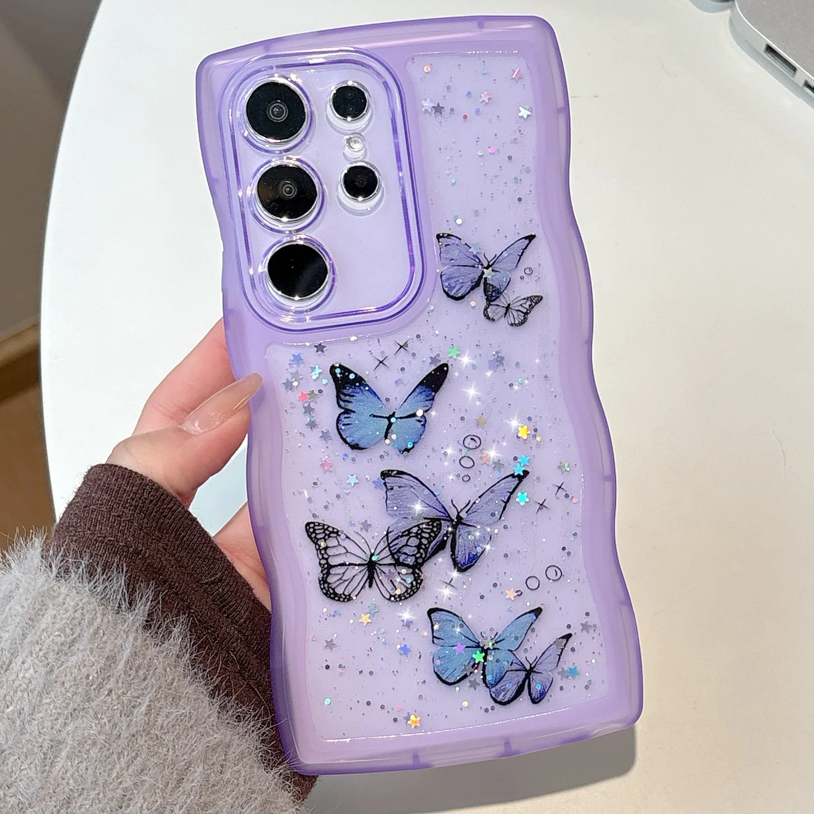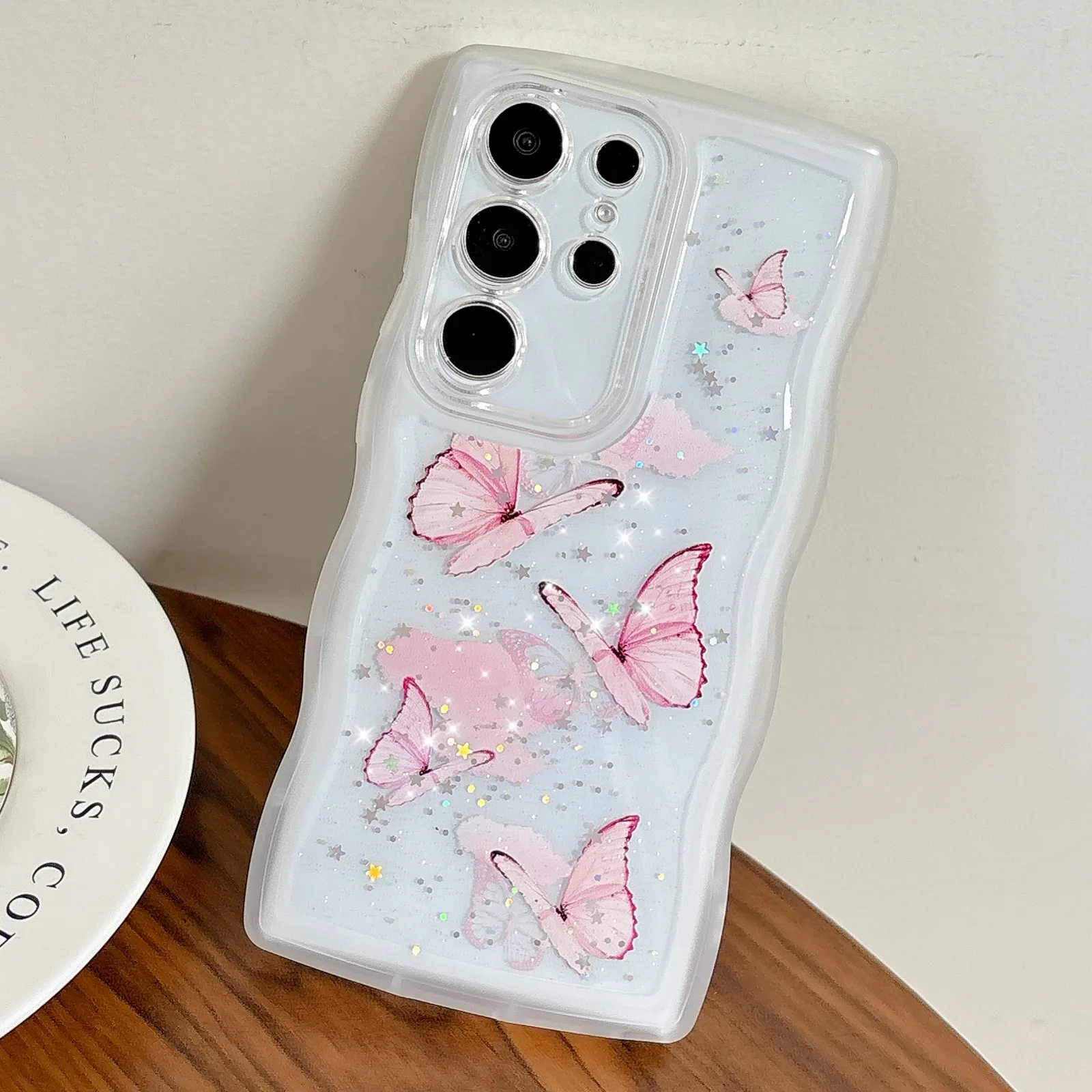 Glitter Starry Sky Butterfly Resin Irregular Wavy Edge Phone Case for Samsung Galaxy S 22 23 24 25 Ultra Plus FE Anti-drop Cover