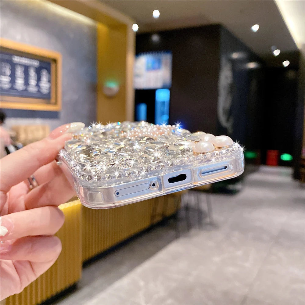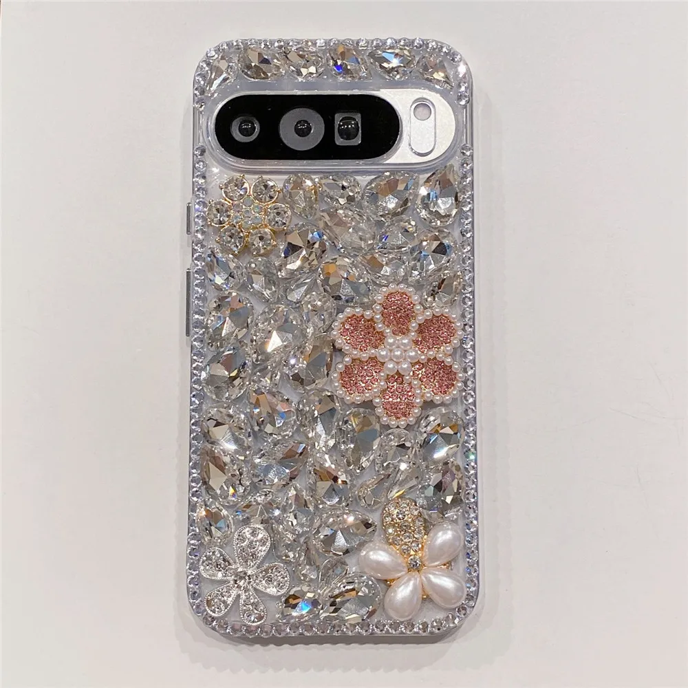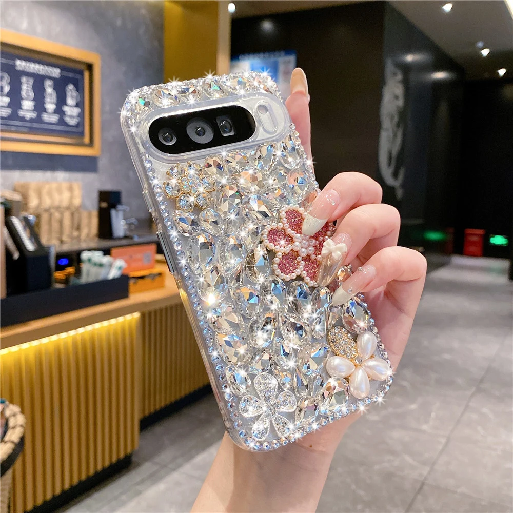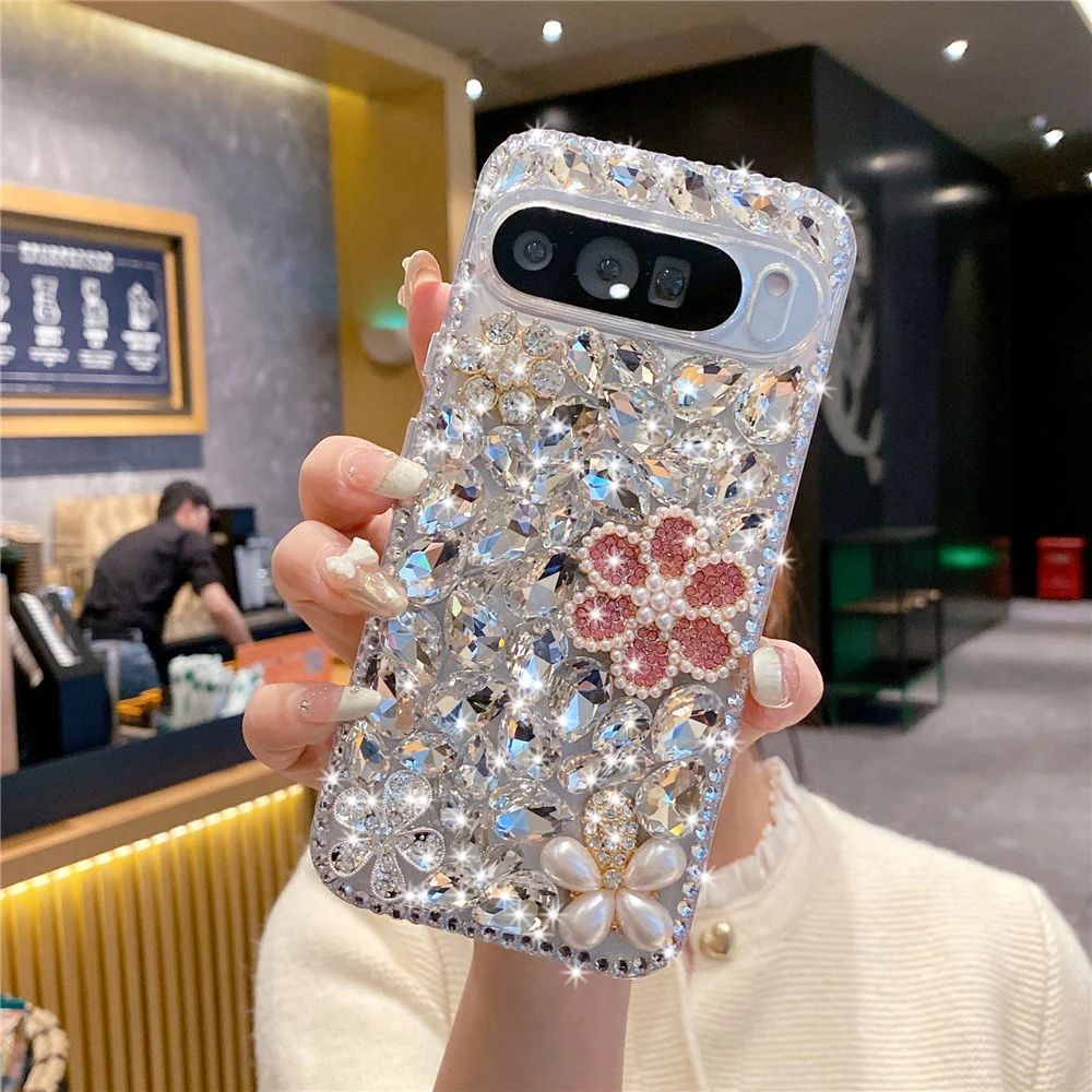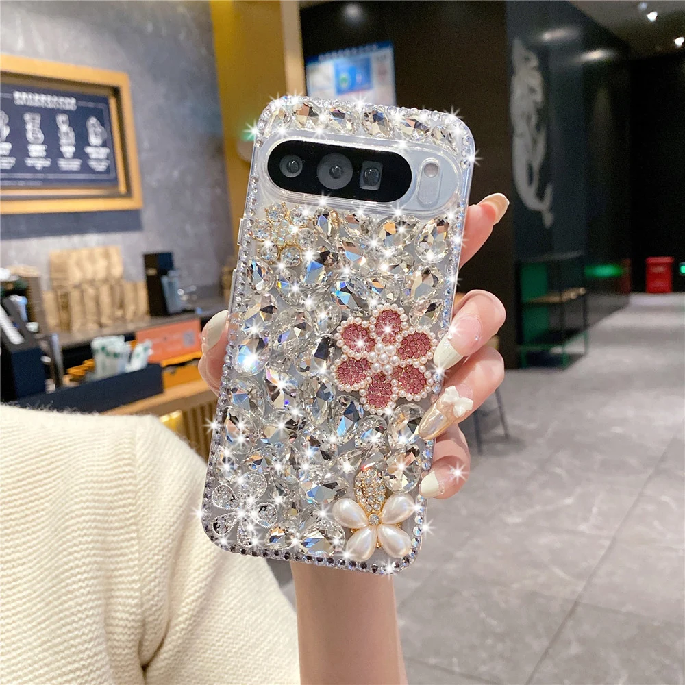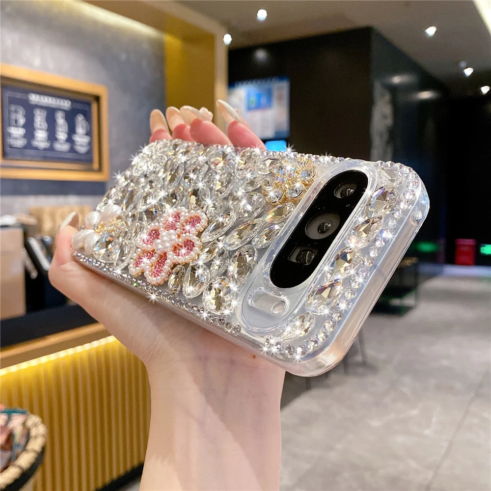 Handmad Diamond Pearl Flower Case For Google Pixel Fold 9 Pro XL 7A 8A 8 9Pro 6A Shine Rhinestone Cover Camera Protection Shell