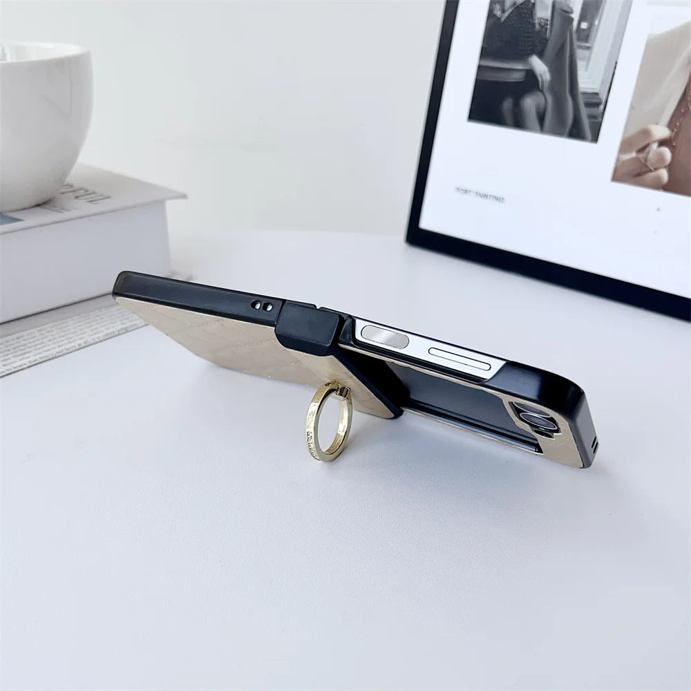 Leather Finger Ring Buckle Case For Samsung Galaxy Z Flip 6 5 4 3 Grid Pattern Stand Holder Shockproof For Galaxy Flip 6 Cover