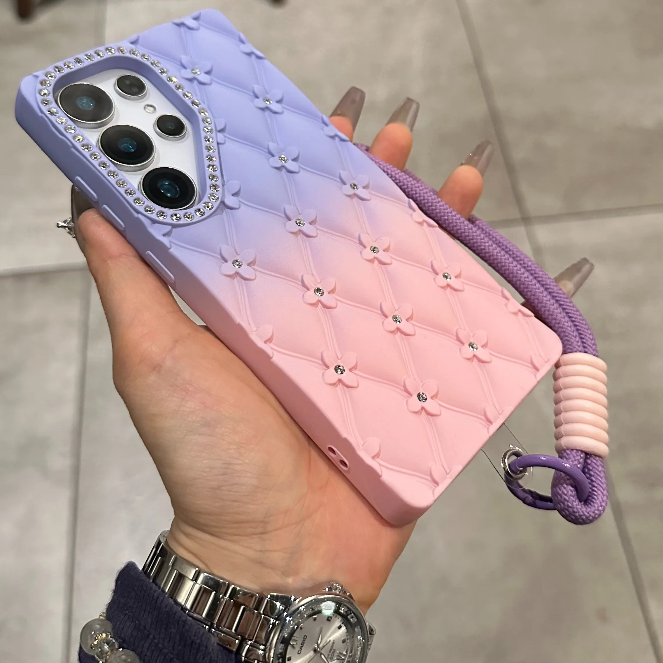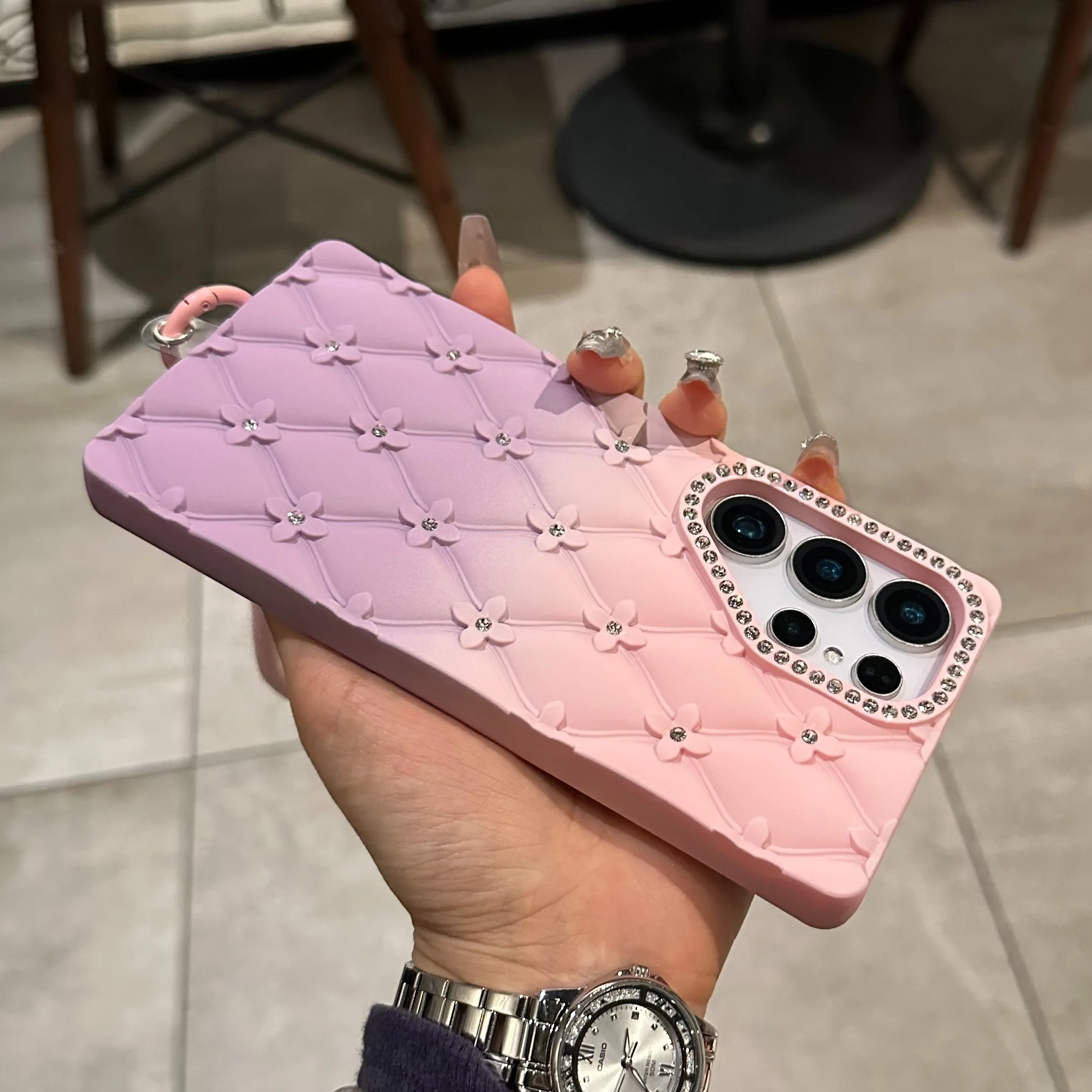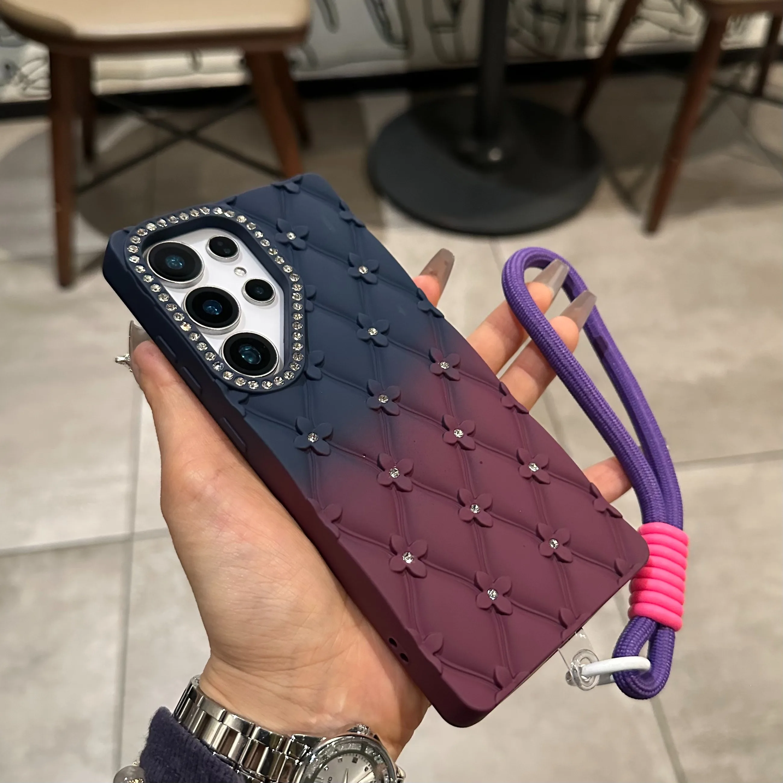 Luxury Glitter Diamond 6D Flowers S25 Edge Gradient Case For Samsung Galxy S25 S24 S23 Ultra Plus FE A26 A16 Wrist Strap Cover