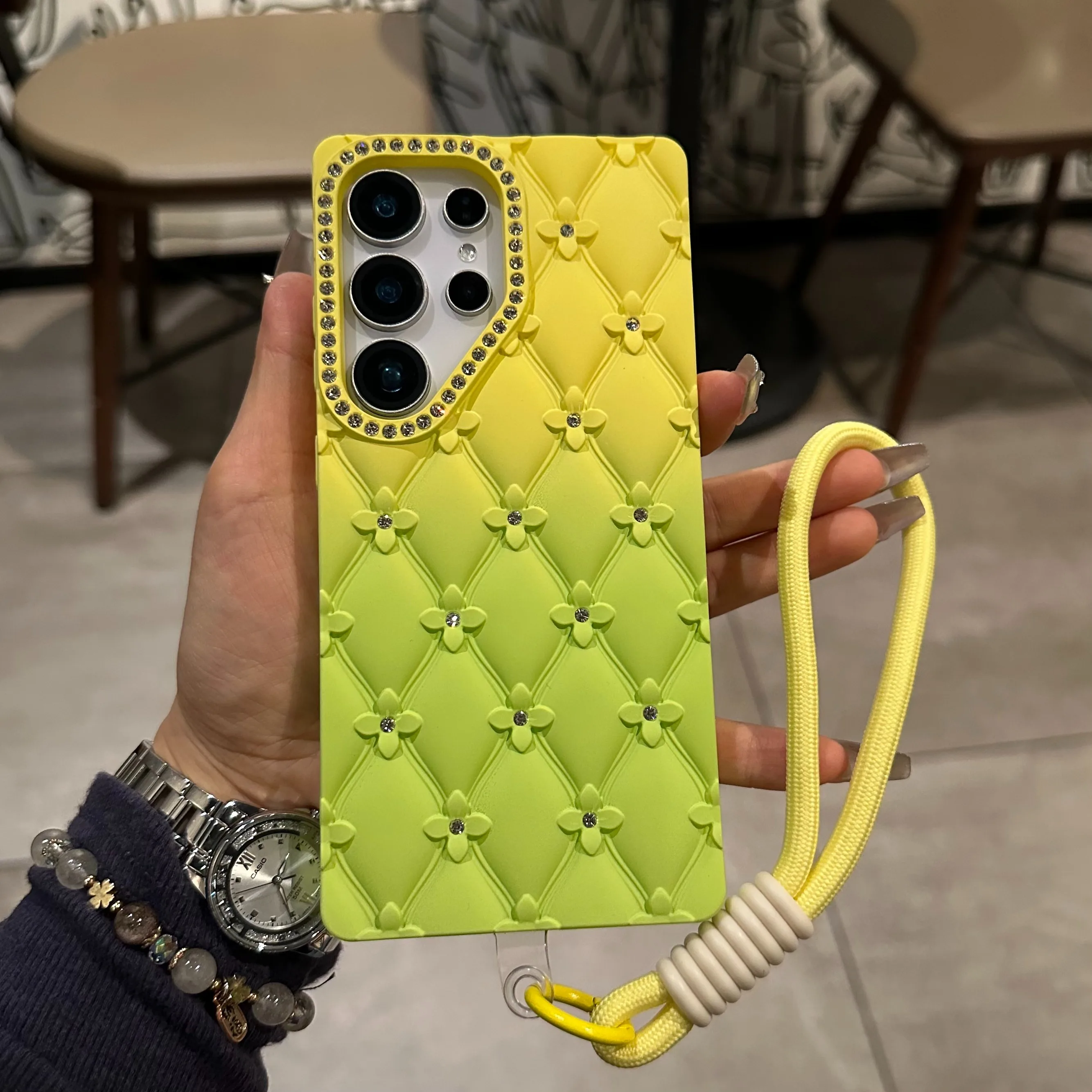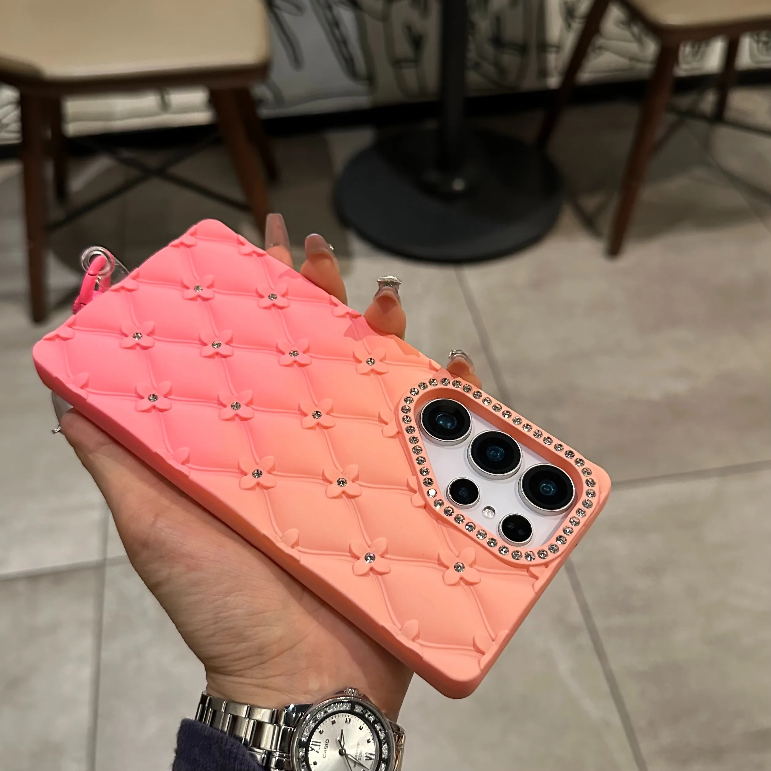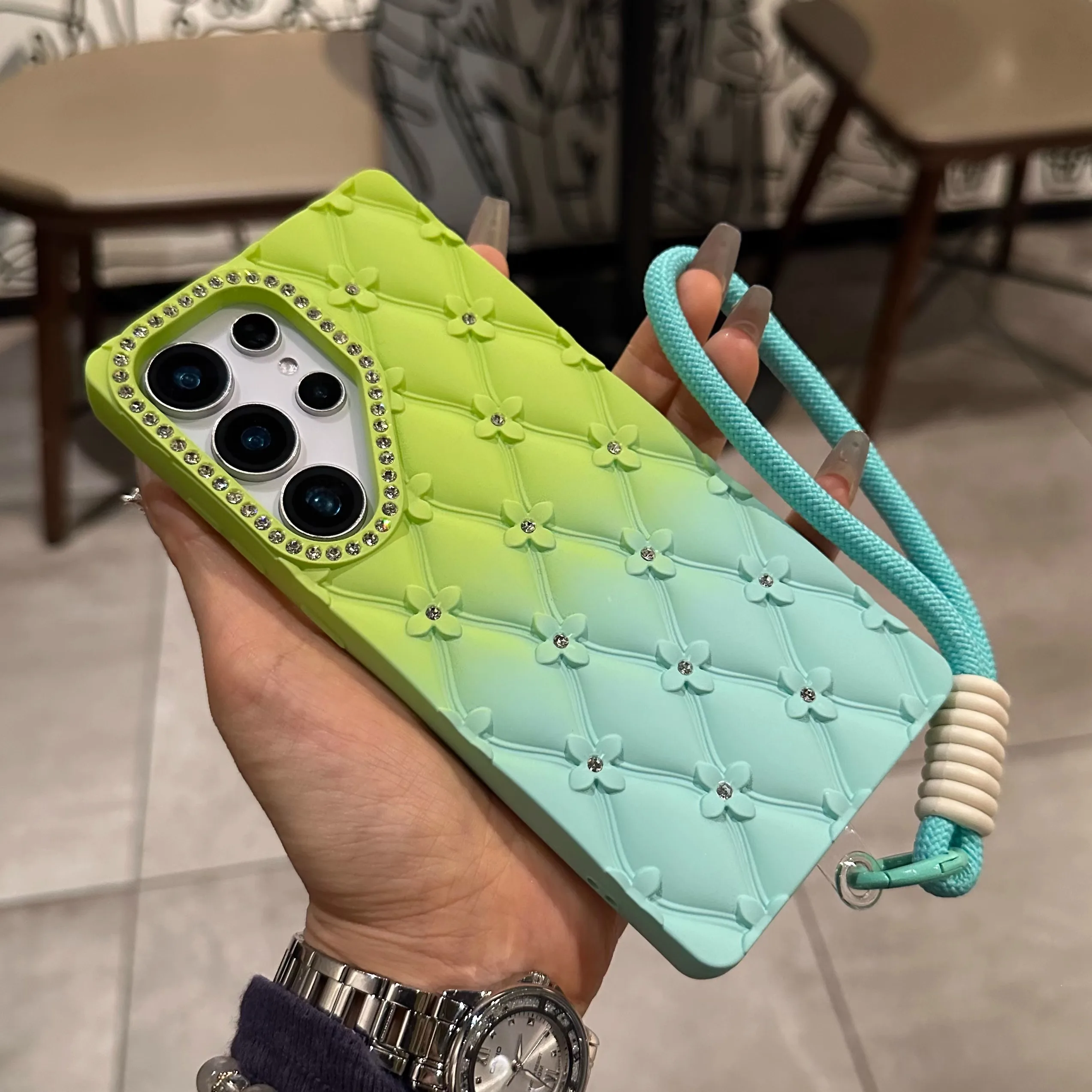 Luxury Glitter Diamond 6D Flowers S25 Edge Gradient Case For Samsung Galxy S25 S24 S23 Ultra Plus FE A26 A16 Wrist Strap Cover