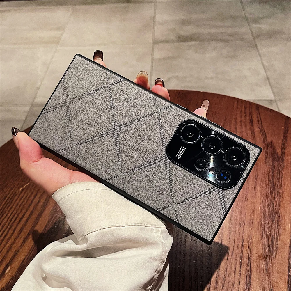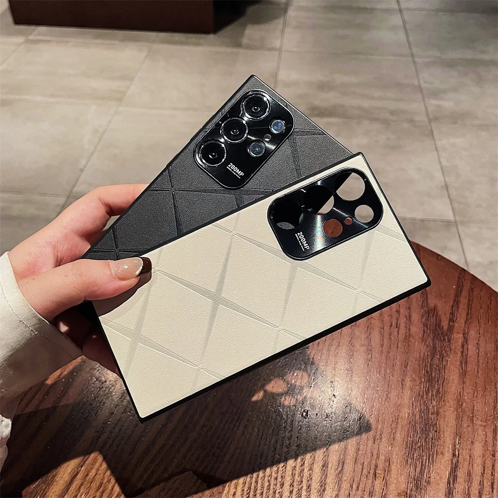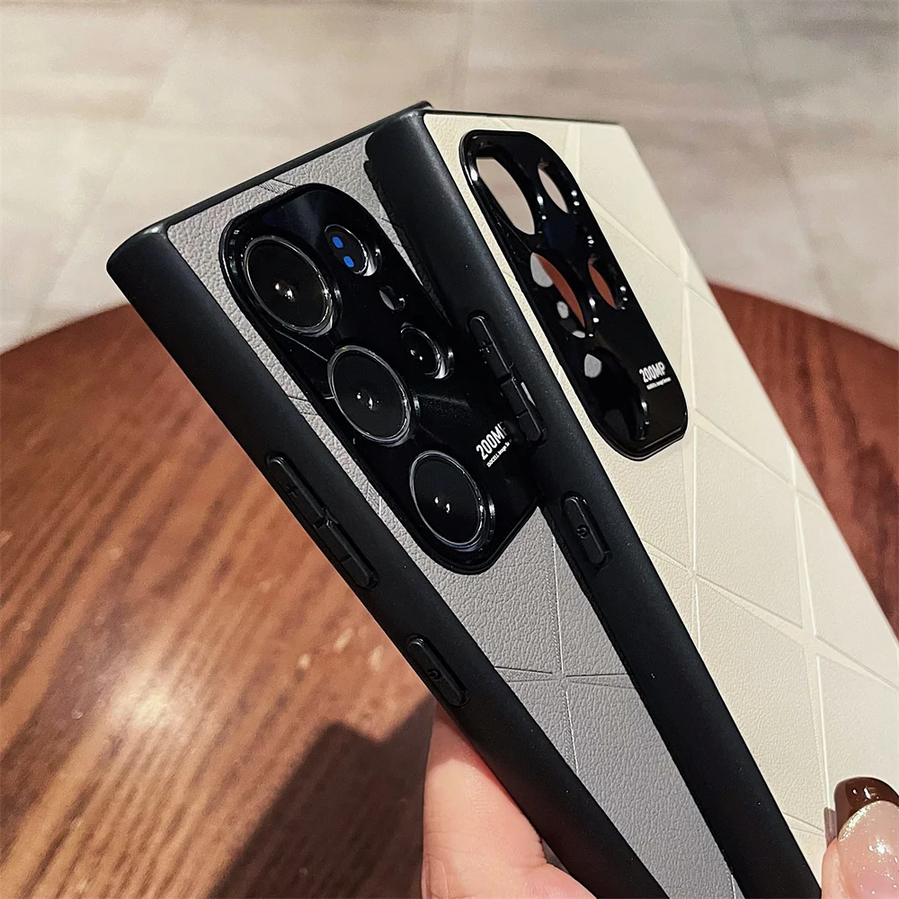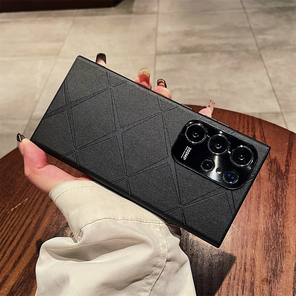 Luxury Plain Leather Diamond Grid Pattern Case For Samsung S25 Plus S24 S23 Ultra S22 Plating Alloy Camera Lens Protection Cover