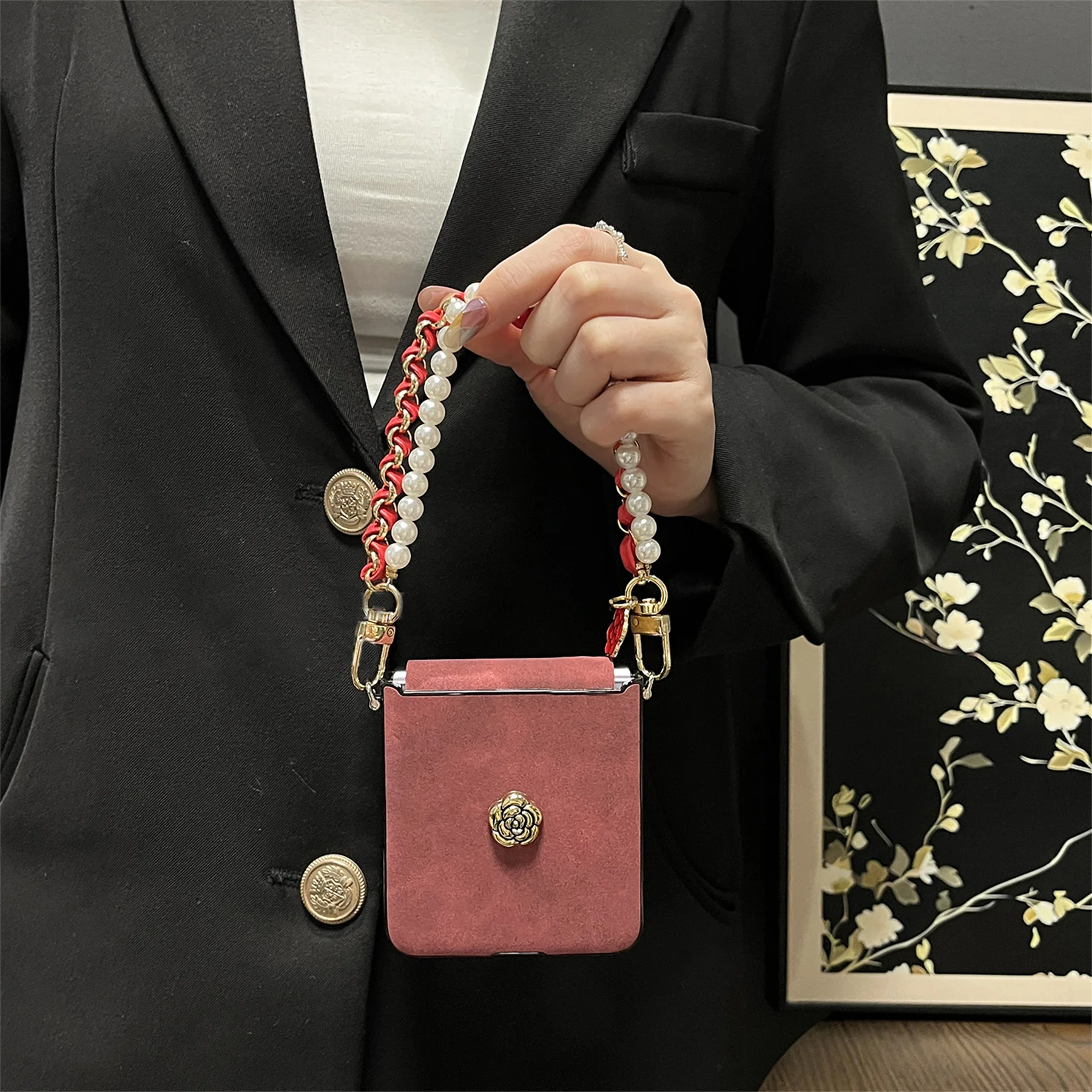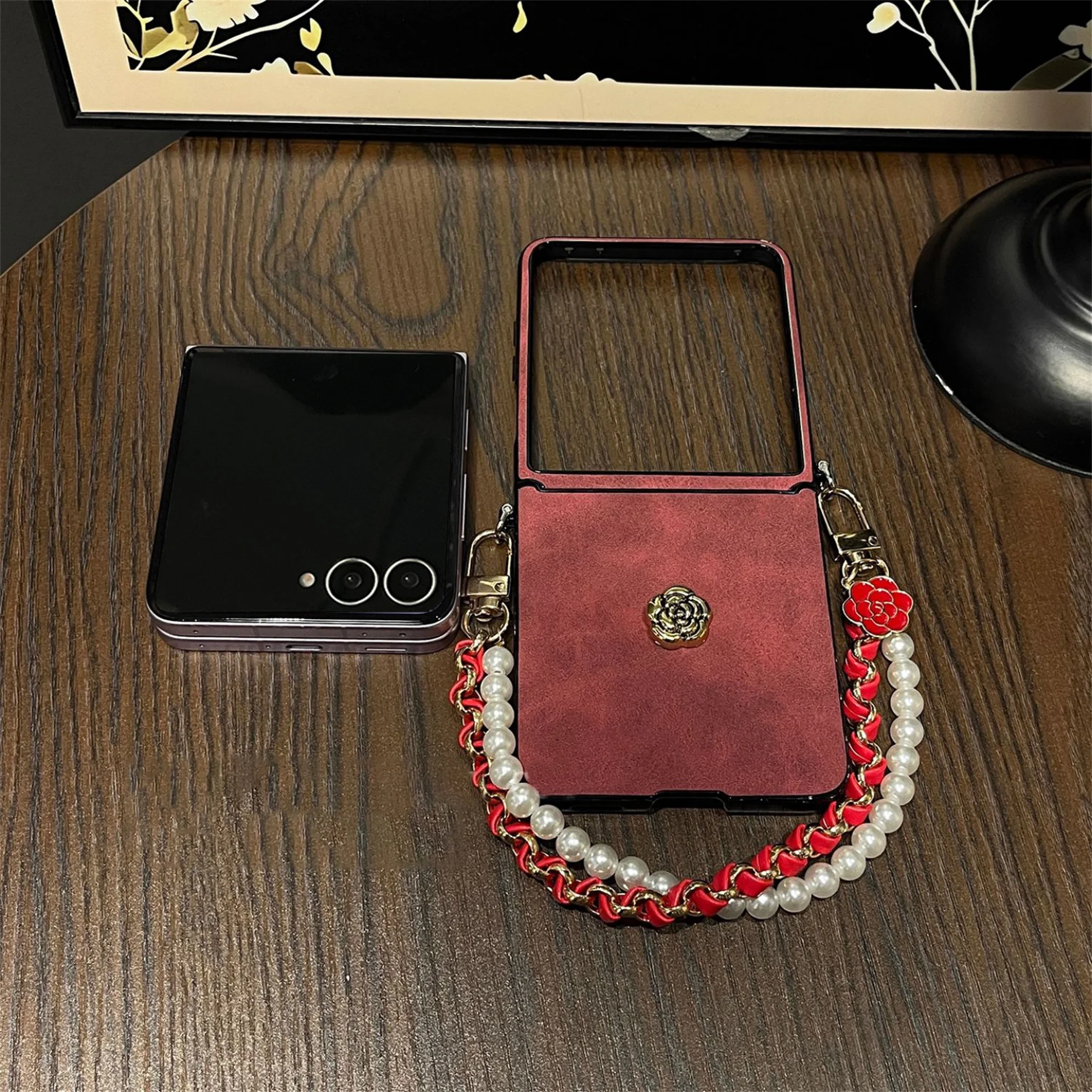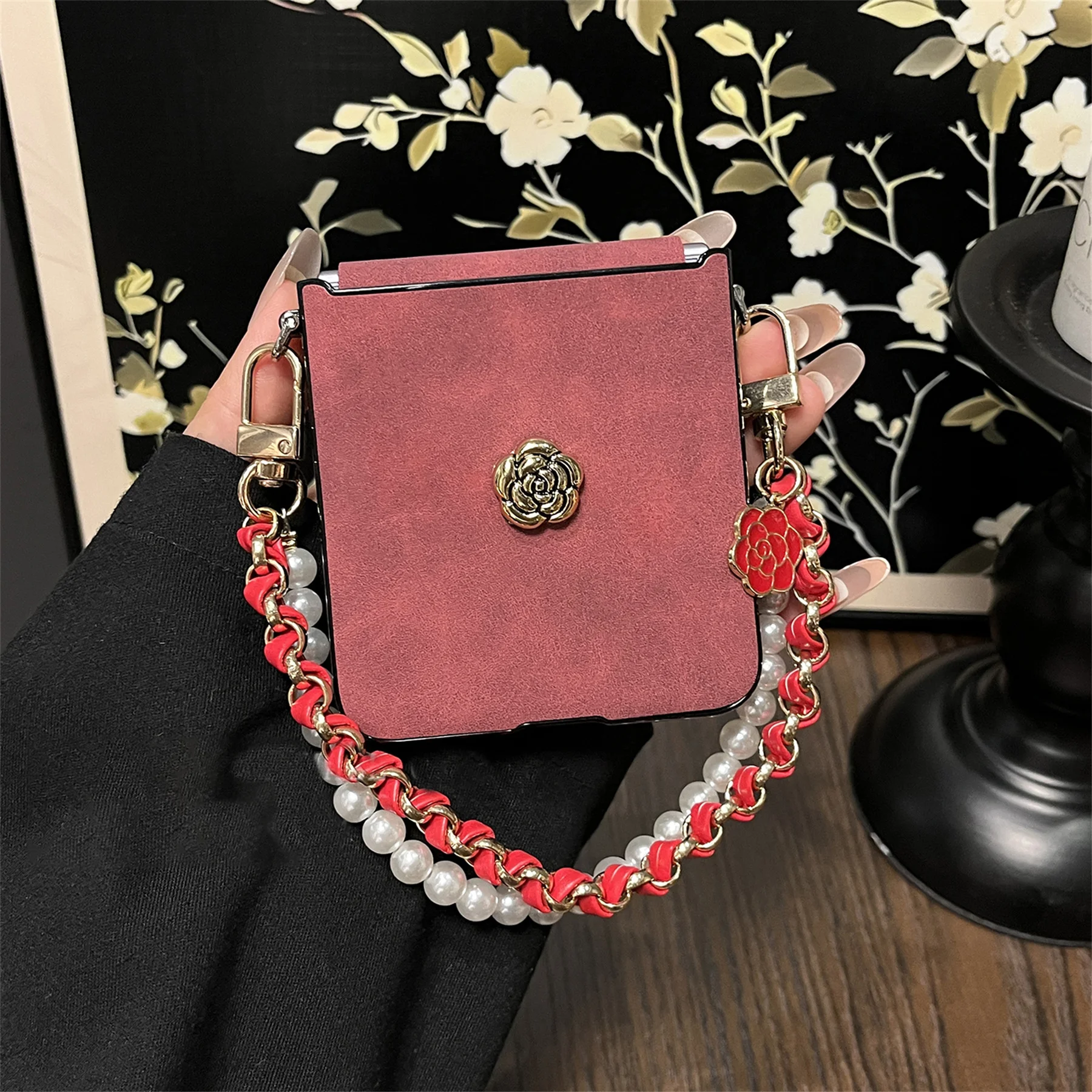 Luxury Sheepskin Camellia Phone Case with Leather Pearl Chain for Motorola Razr 60 Ultra Razr2025 Razr 50Ultra Cover