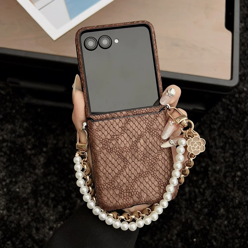 Luxury Snake Texture PU Leather Case For Samsung Galaxy Z Flip7 Flip 7 6 5 4 Zflip6 Case Pearl Flower Bracelet Strap Back Cover