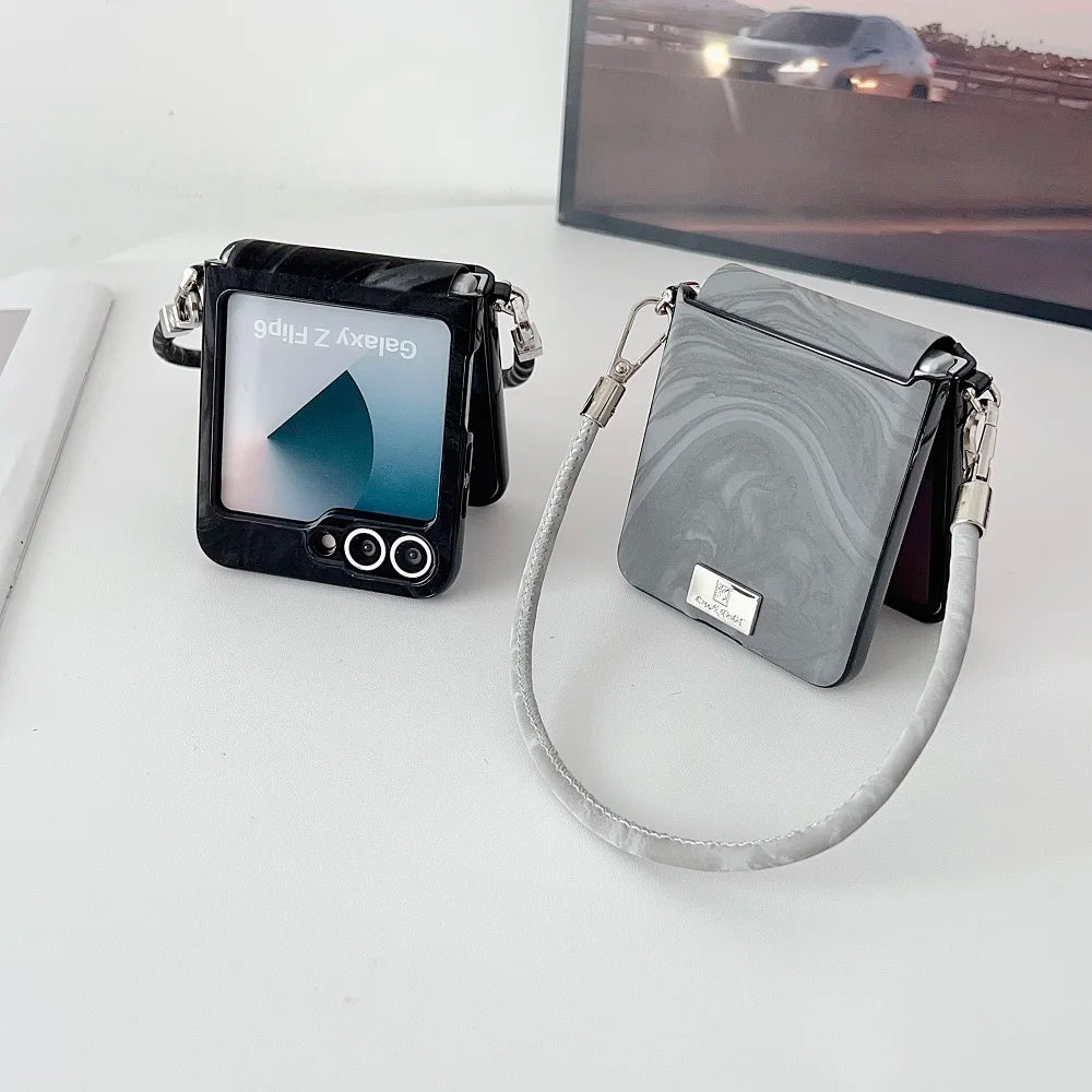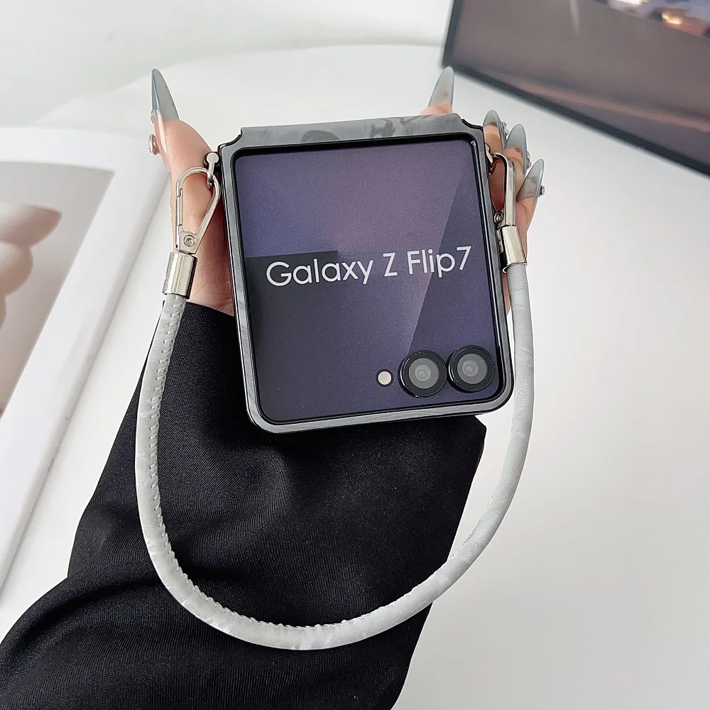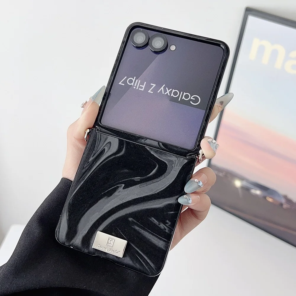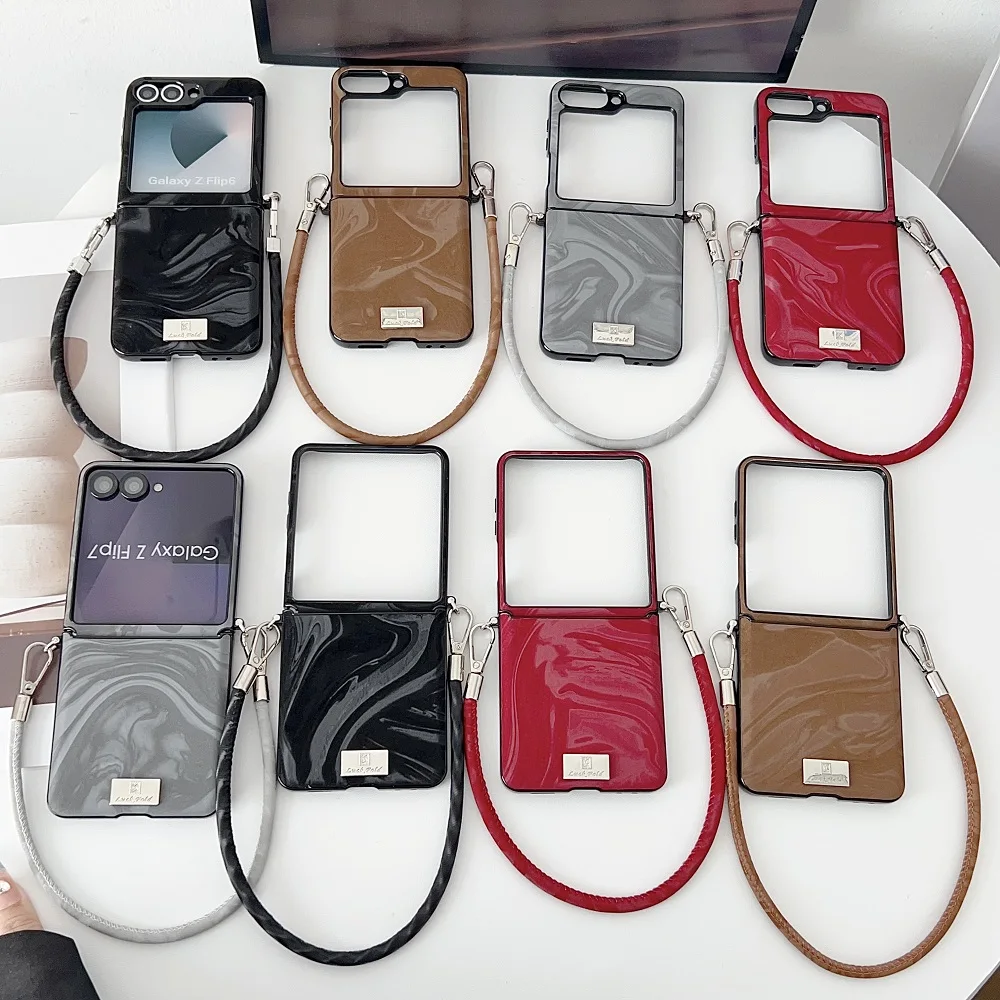Luxury Water Ripple PU Leather Phone Case For Samsung Galaxy Z Flip 7 6 5 4 3 Flip7 FE Protection Folding Cover with Lanyard
