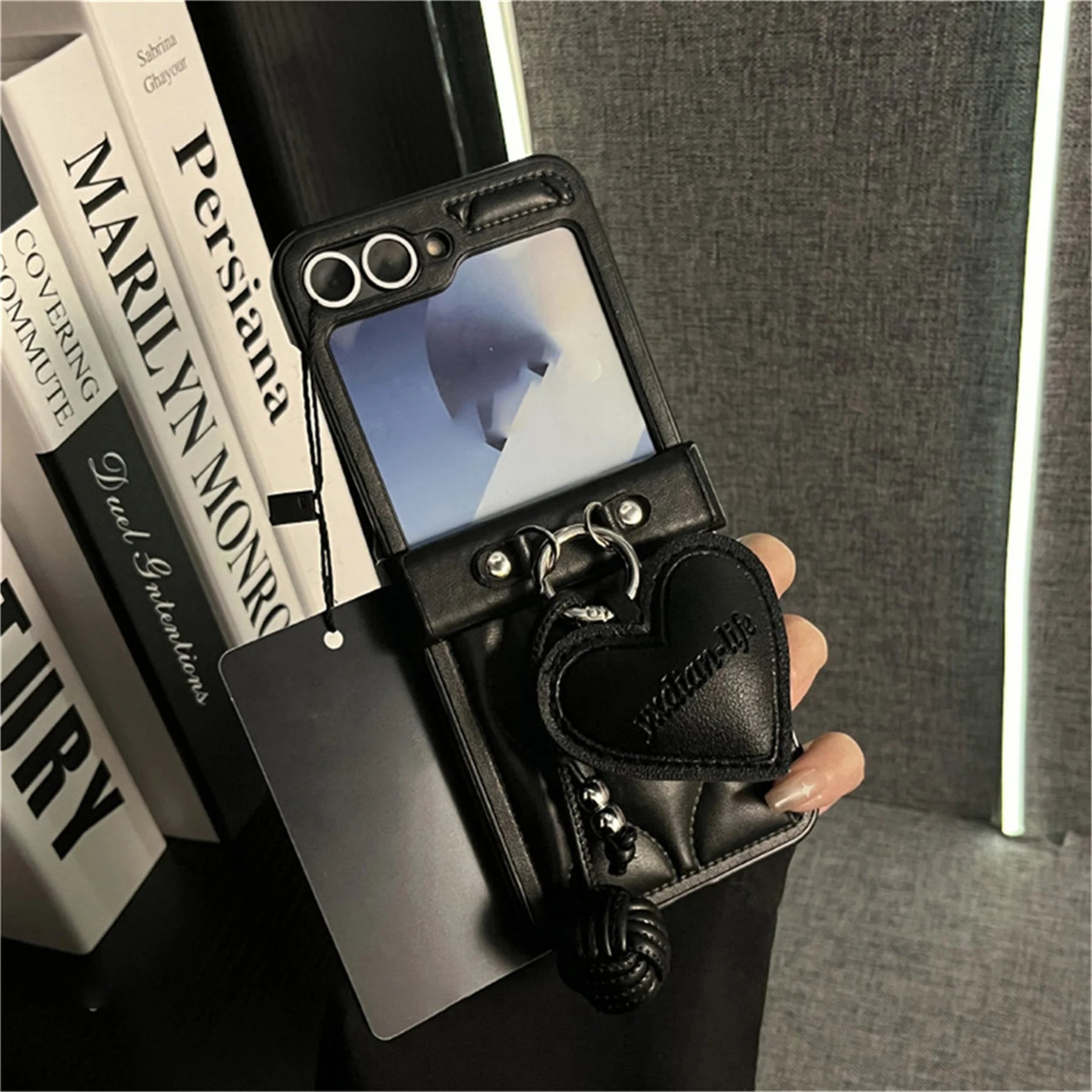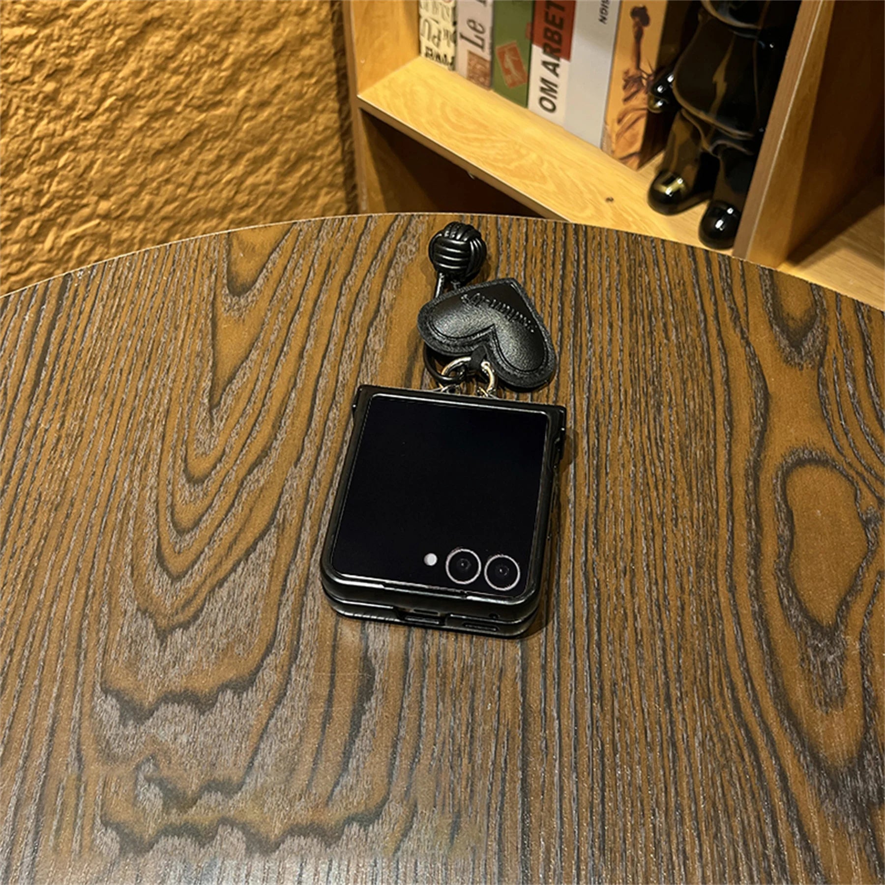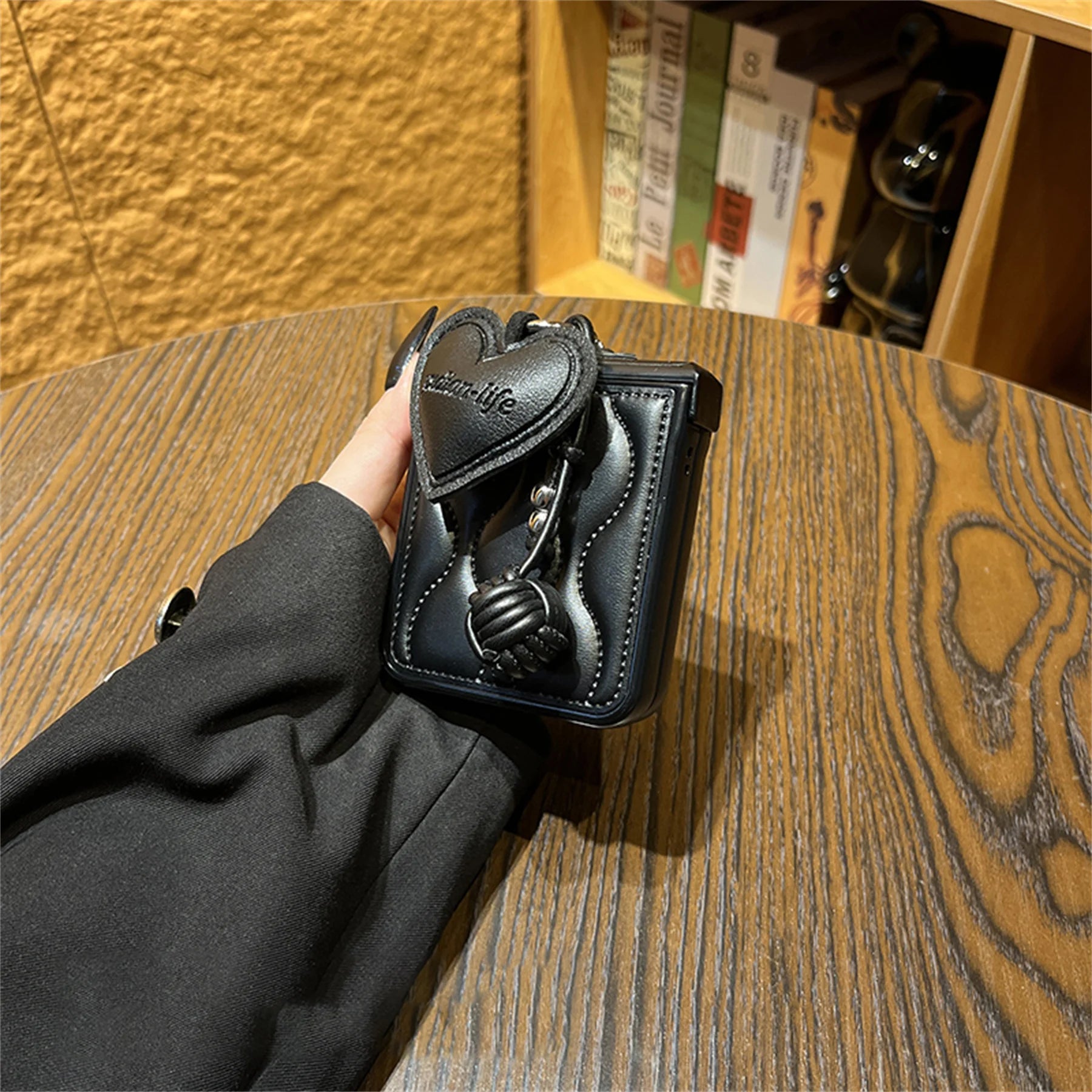 Luxury Wave Black Phone Case with Love Heart Pendant for Samsung Galaxy Z Flip 7 Z Flip6 ZFlip 5 Zflip6 Zflip7 Cover
