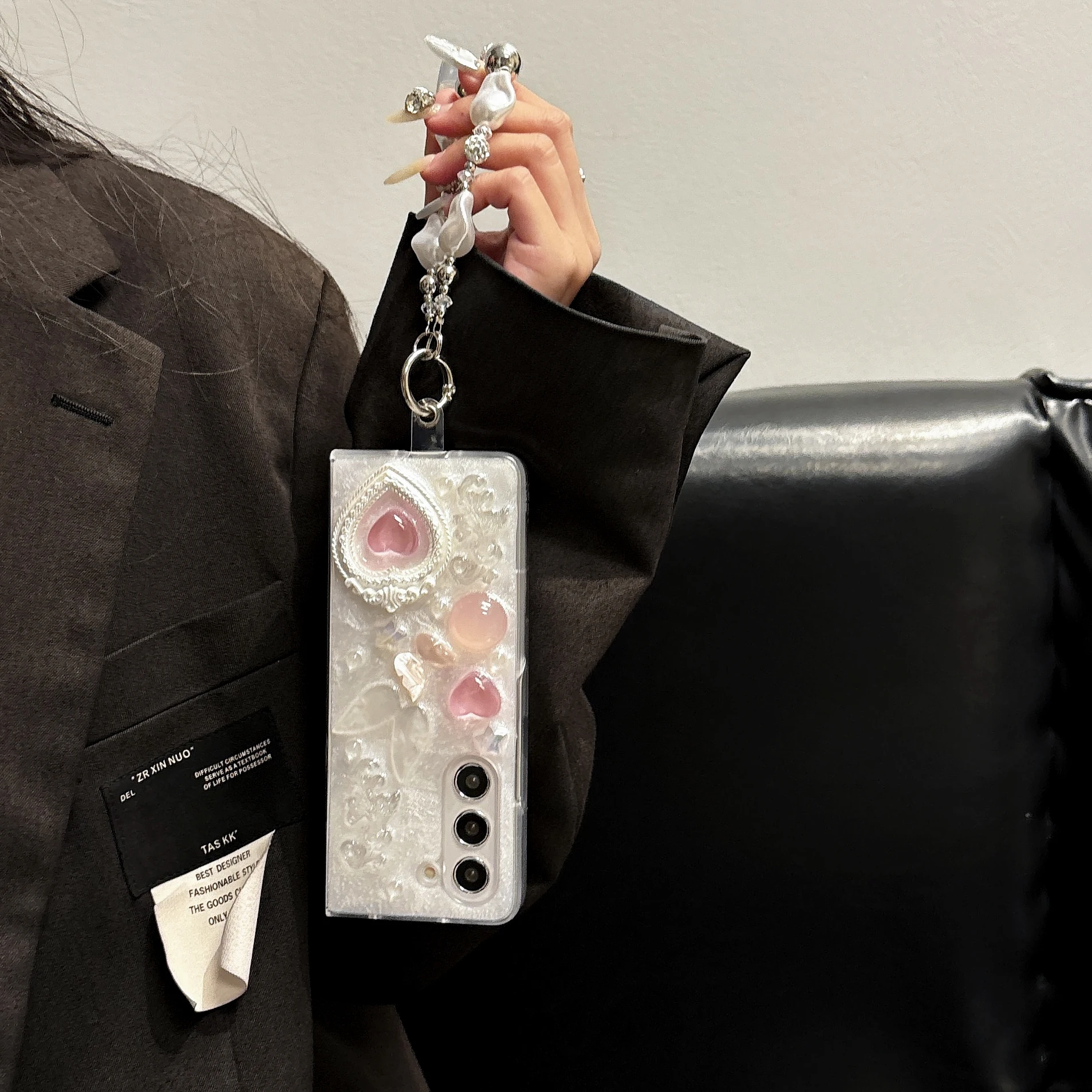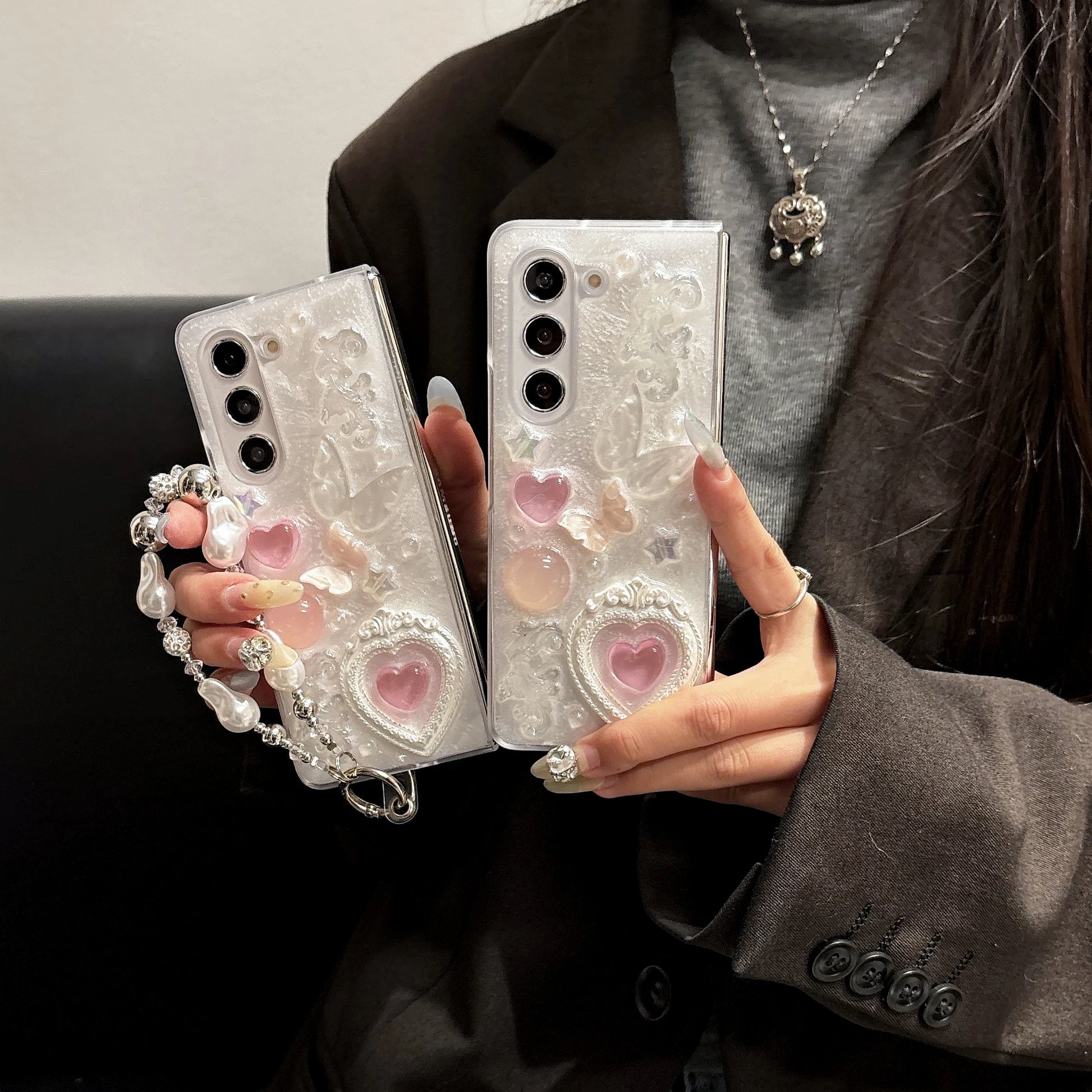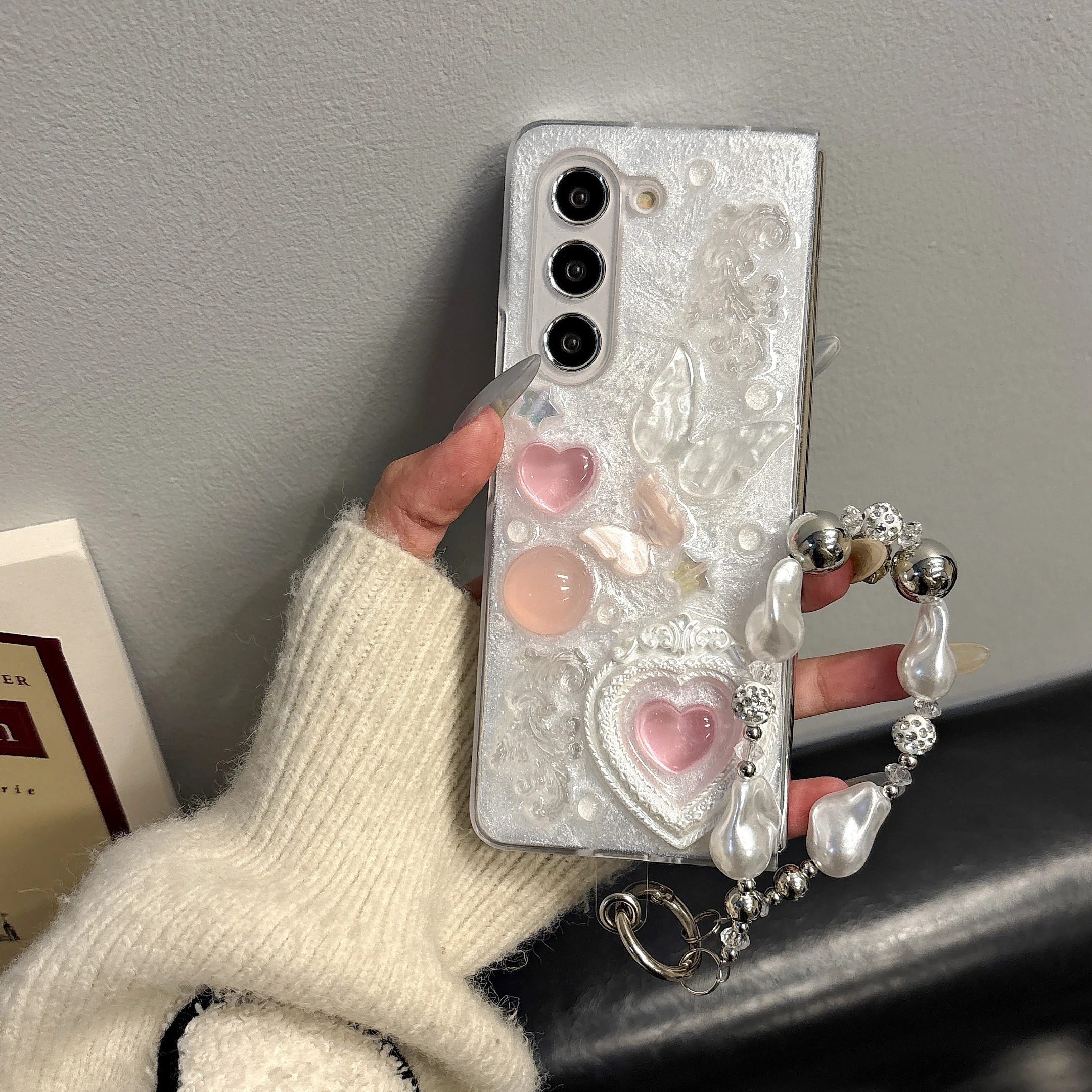 Pink heart-shaped 3D phone case for Samsung Galaxy Z Fold 6 5 4 rear cover pearl bracelet shock-absorbing phone case