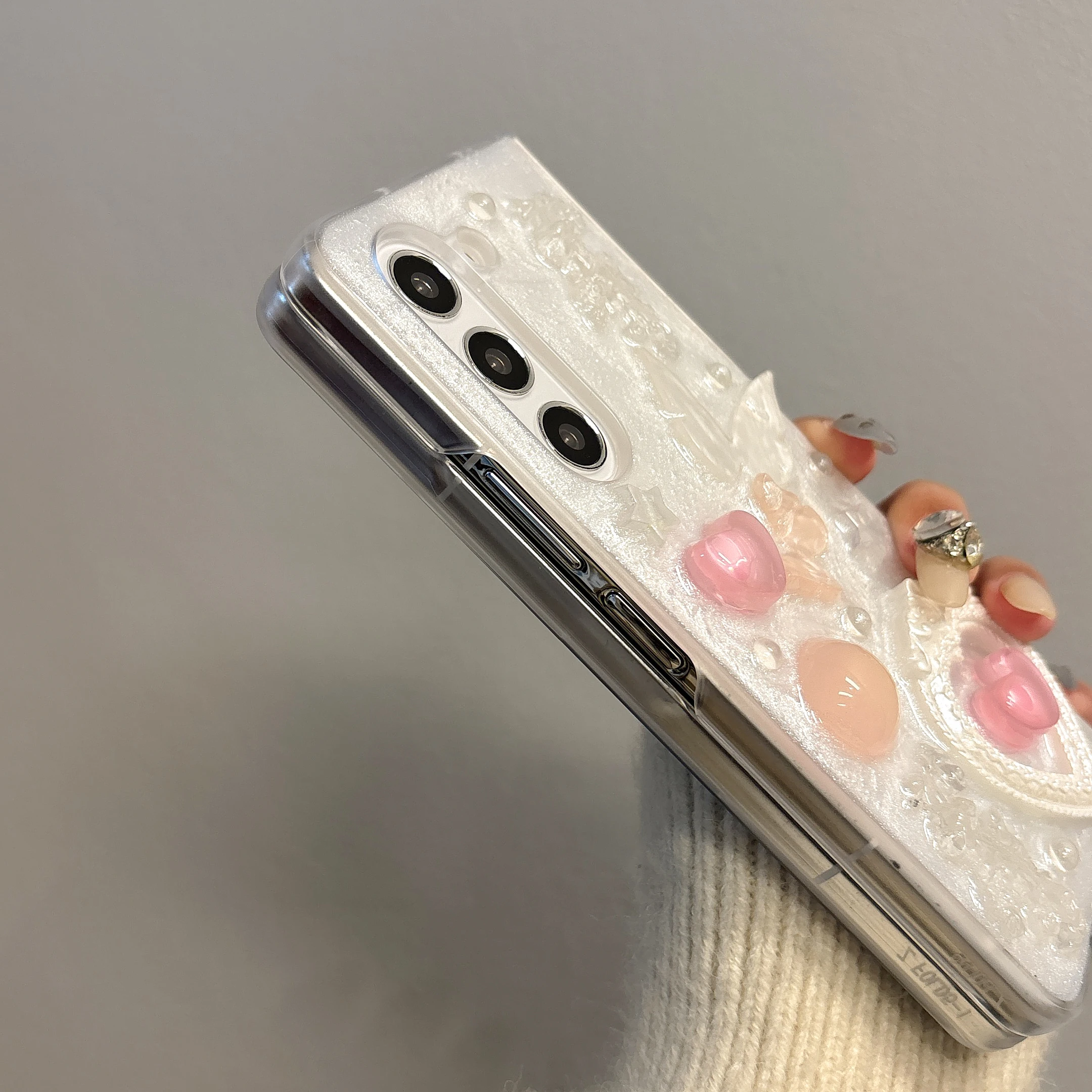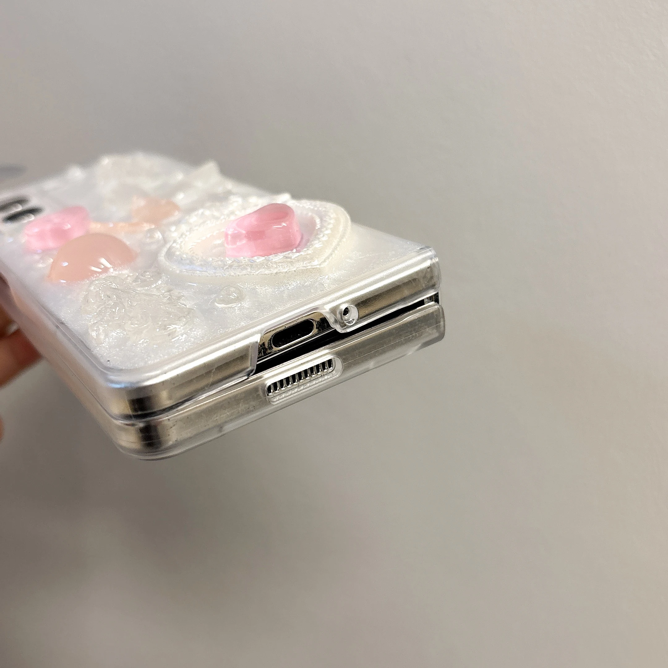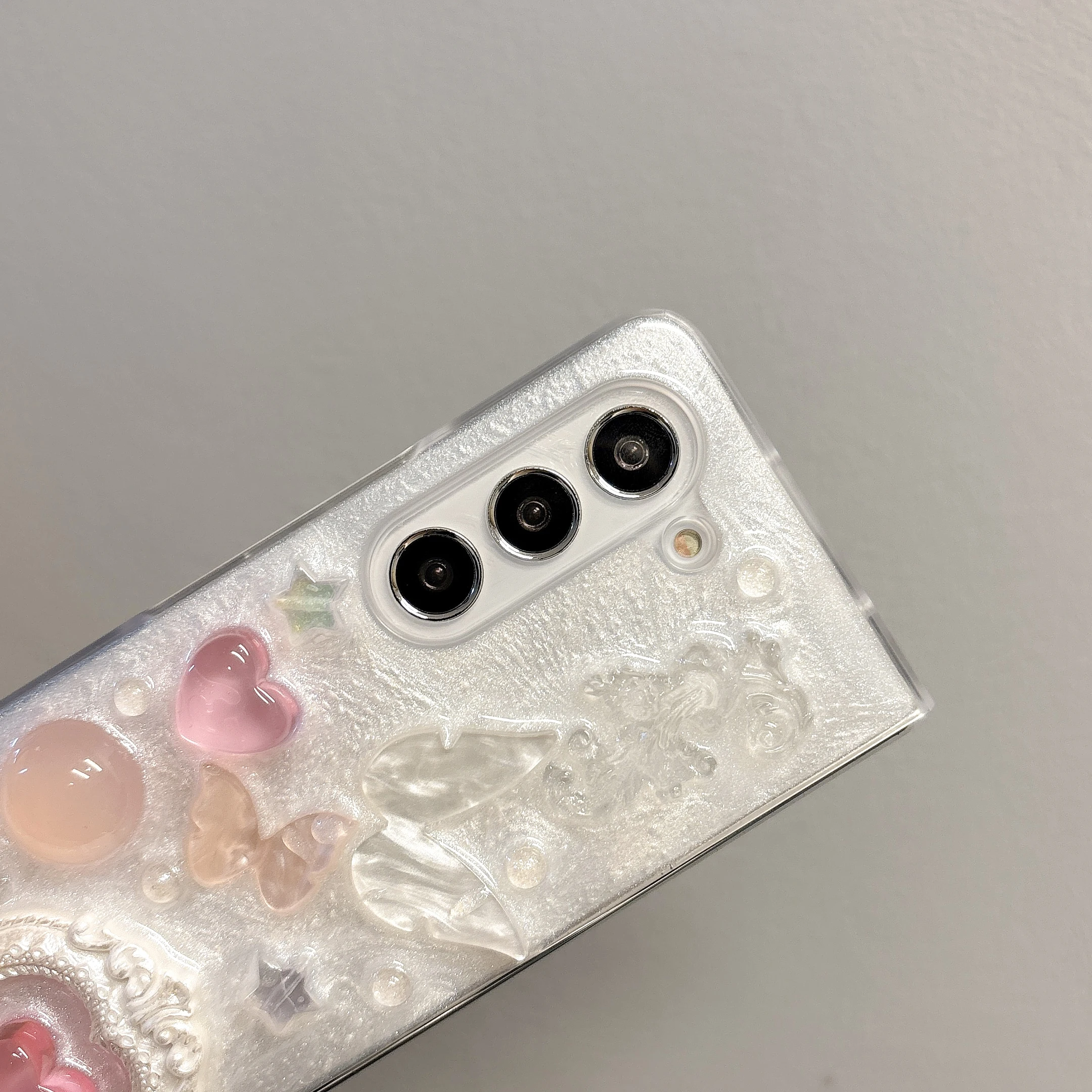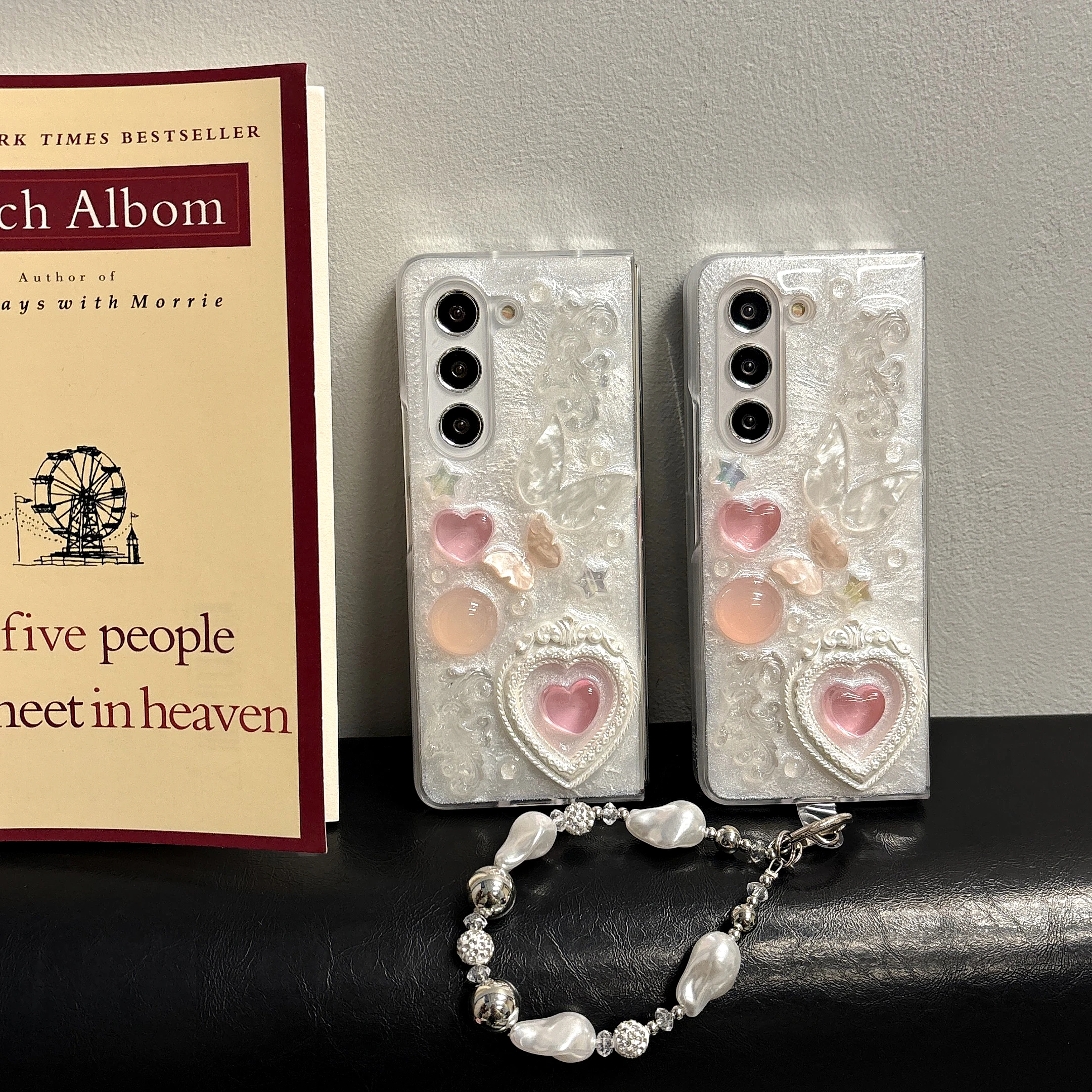 Pink heart-shaped 3D phone case for Samsung Galaxy Z Fold 6 5 4 rear cover pearl bracelet shock-absorbing phone case