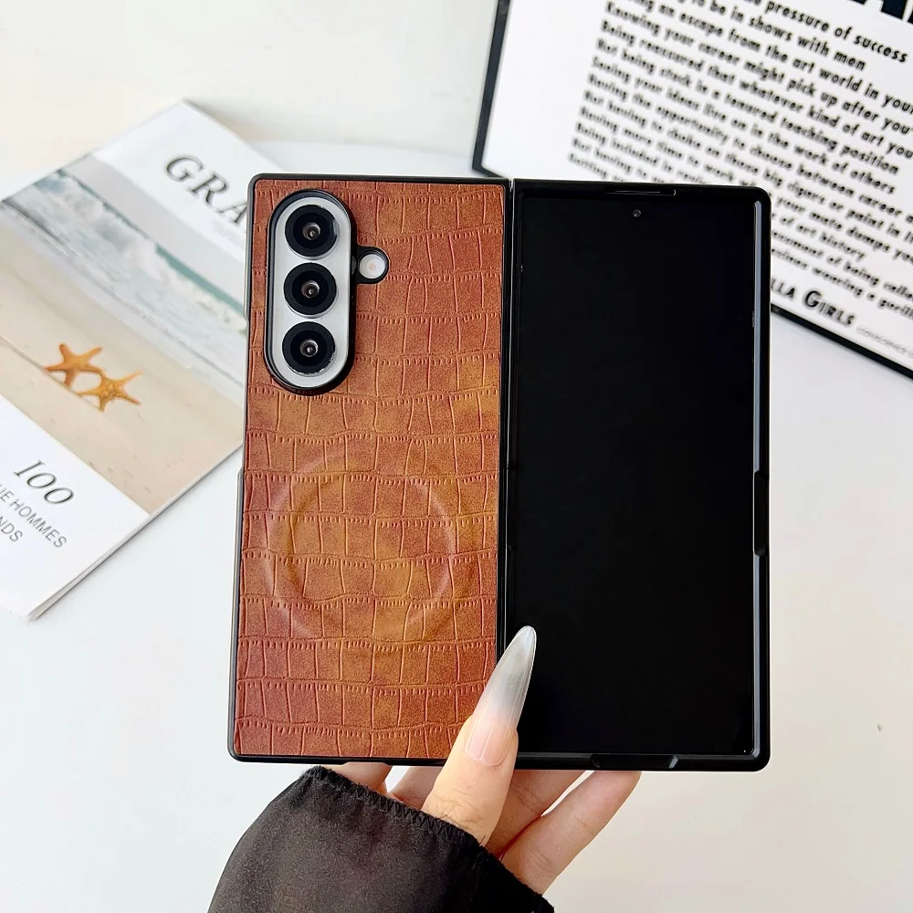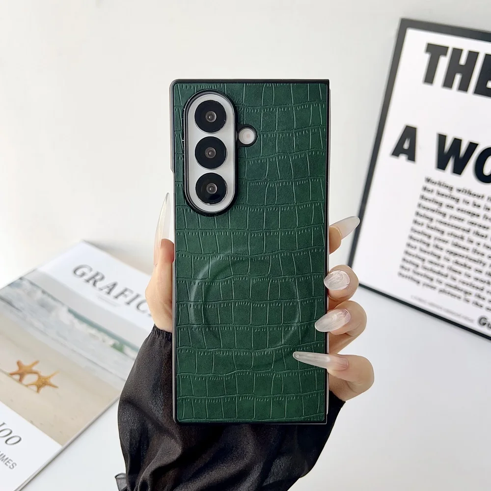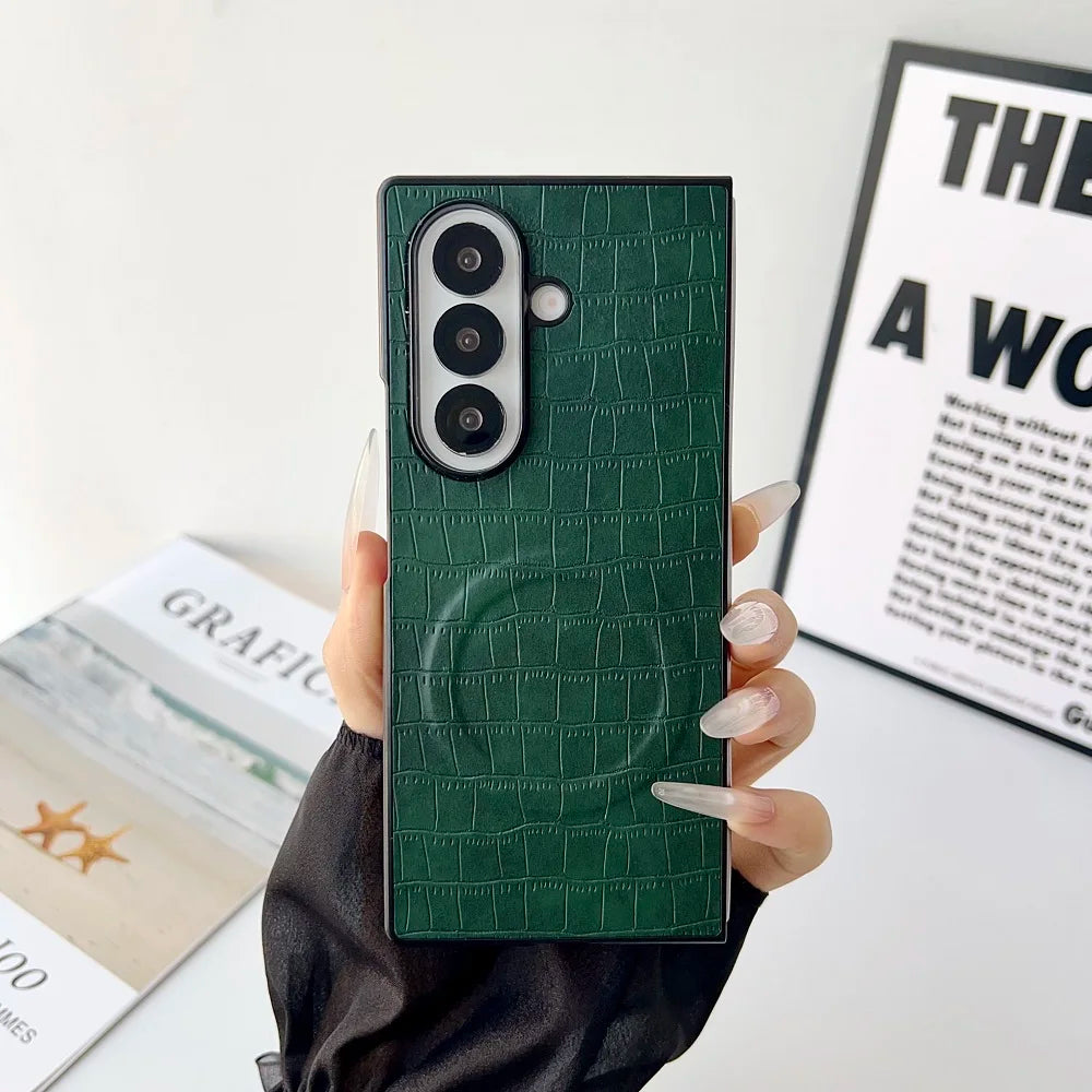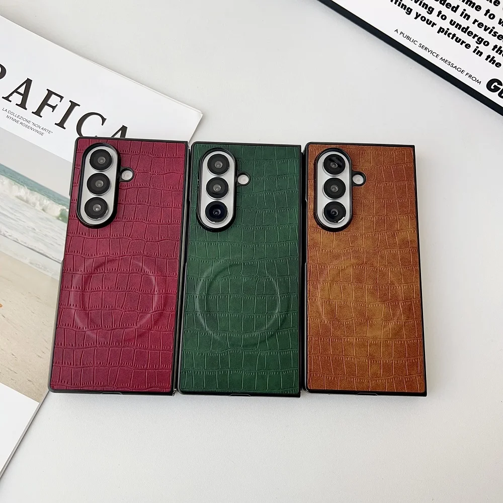 Solid Color Crocodile Pattern PU Leather Phone Case For Samsung Galaxy Z Fold 7 6 5 4 3 For Magnetic Charging Protection Cover