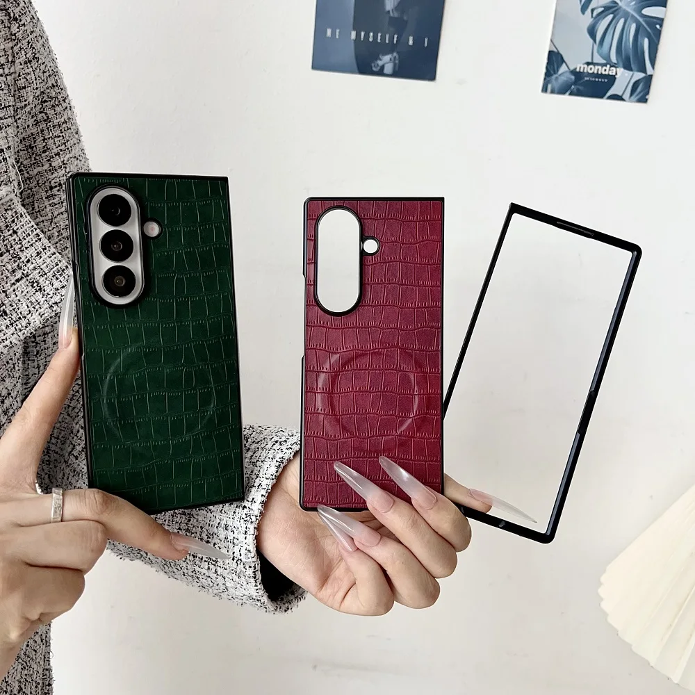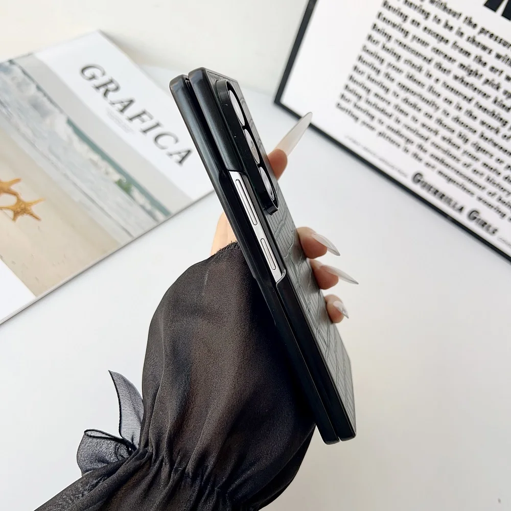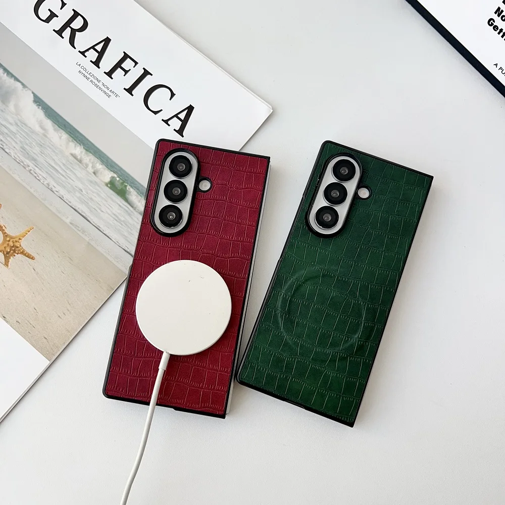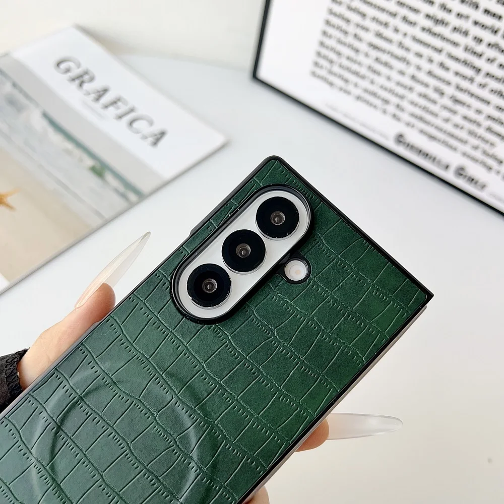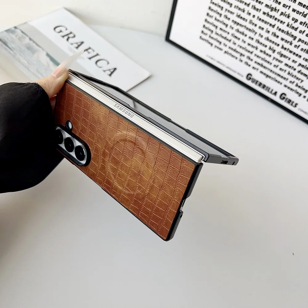 Solid Color Crocodile Pattern PU Leather Phone Case For Samsung Galaxy Z Fold 7 6 5 4 3 For Magnetic Charging Protection Cover