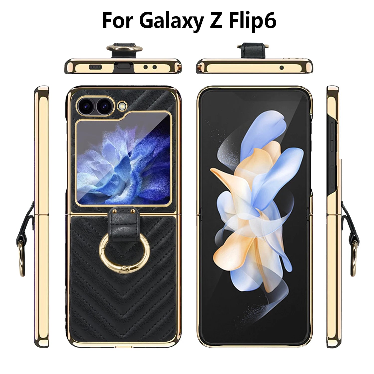 VIETAO Compatible With Samsung Galaxy Z Flip7 6 5 4 3 Golden Plated Finger Ring Holder Kickstand Leather Mobile Phone Case, Blue